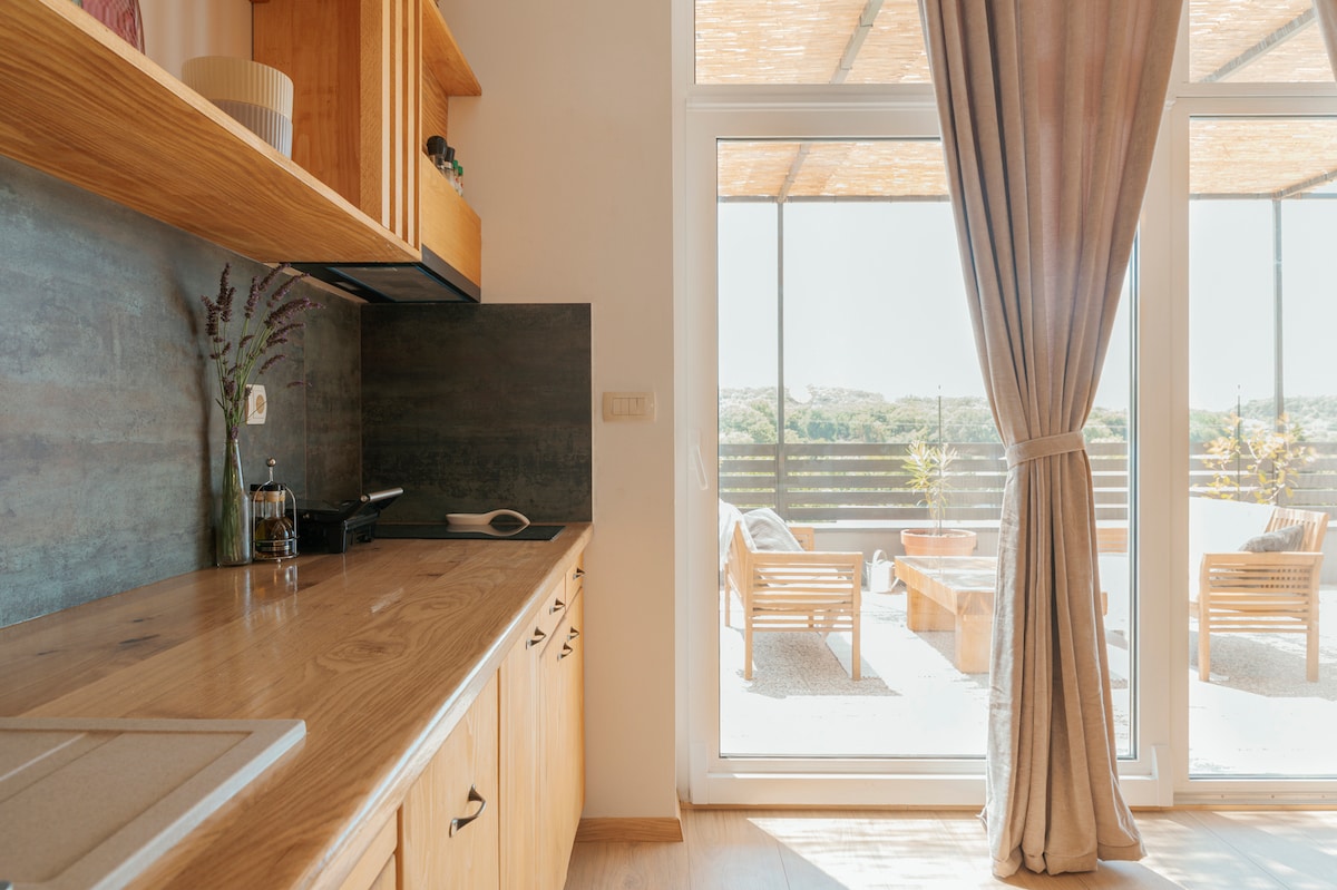 Deze unieke accommodatie heeft een geheel eigen stijl. Studio-appartement met 80 vierkante meter terras dat alleen voor jou is. Alle meubels zijn handgemaakt en de muren zijn versierd met foto's van Pula. De oude radio in de keuken en de klok geven een vleugje nostalgie. Een verblijf in deze studio is een bijzondere ervaring.