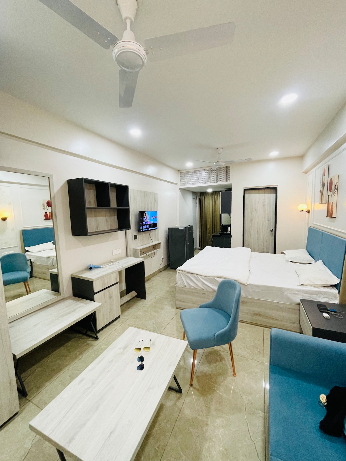 Stijlvolle studio in prime Jagatpura, vlakbij Bombay Hospital. Perfect voor reizigers, stellen of zakelijke gasten die op zoek zijn naar comfort en gemak. Beschikt over een kingsize bed, gezellige bank, airconditioning, tv, snelle wifi en een eigen werkplek. Geniet van een volledig uitgeruste kitchenette met magnetron en broodrooster. Ontspan in het zwembad of de elegante lobby. 24/7 roomservice zorgt voor een probleemloos verblijf. De moderne badkamer is sprankelend schoon met premium fittingen, warm water en schone handdoeken.