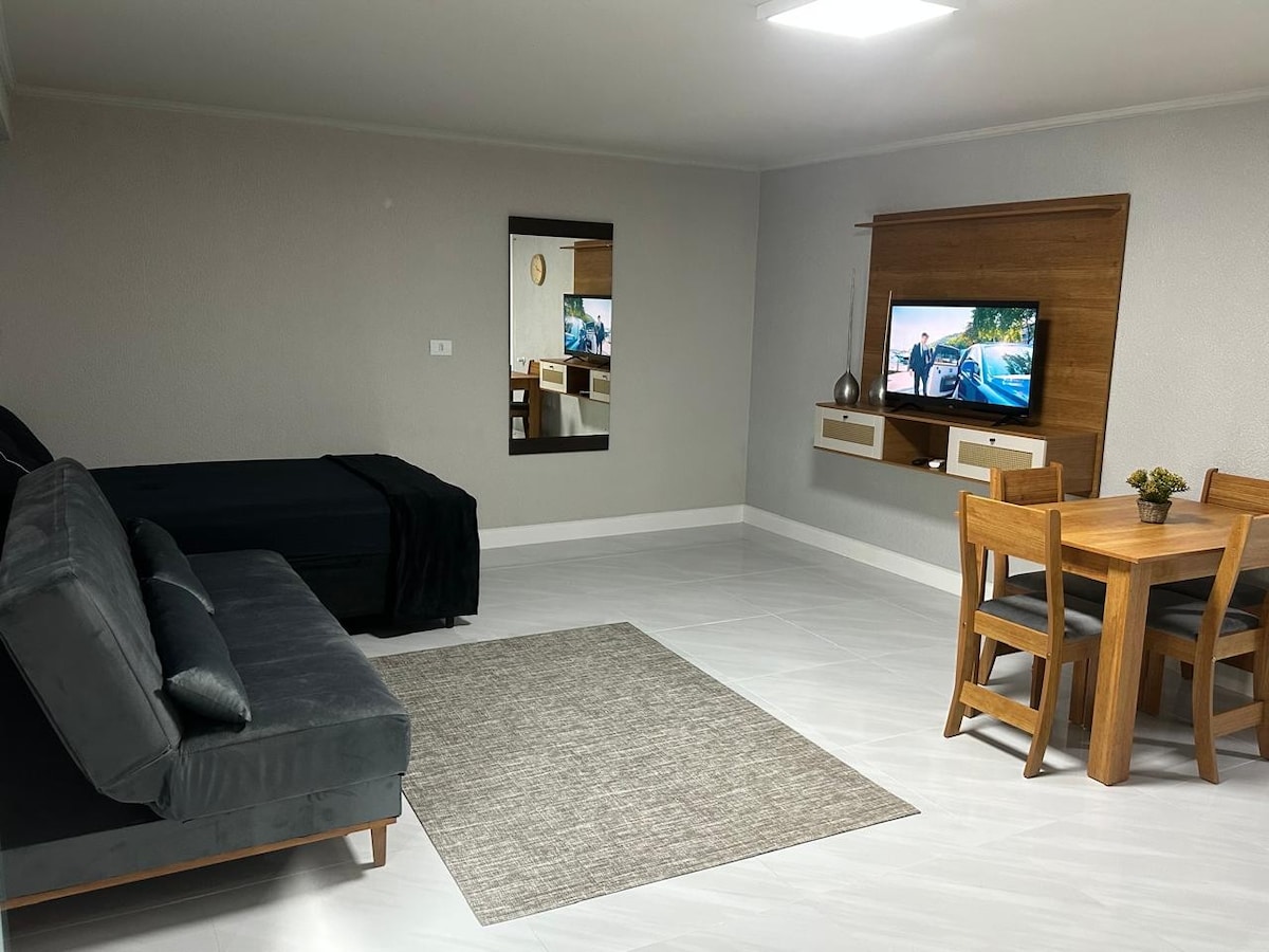 Casa studio, Jaraguá do Sul - SC. Gezellige en zeer schone plek met capaciteit voor maximaal 3 personen. Het heeft een tweepersoonsbed en een slaapbank, een volledige keuken voor snelle maaltijden, split inverter airconditioning, wifi, een eigen badkamer, een gordijn, een jaloezie en een wasmachine. Dicht bij supermarkten, bakkerij, benzinestation, restaurant en op slechts 4 km van de centrale regio en 2 km van de katholieke universiteit van de stad. ROKEN niet toegestaan in de binnenruimte. Huisdier