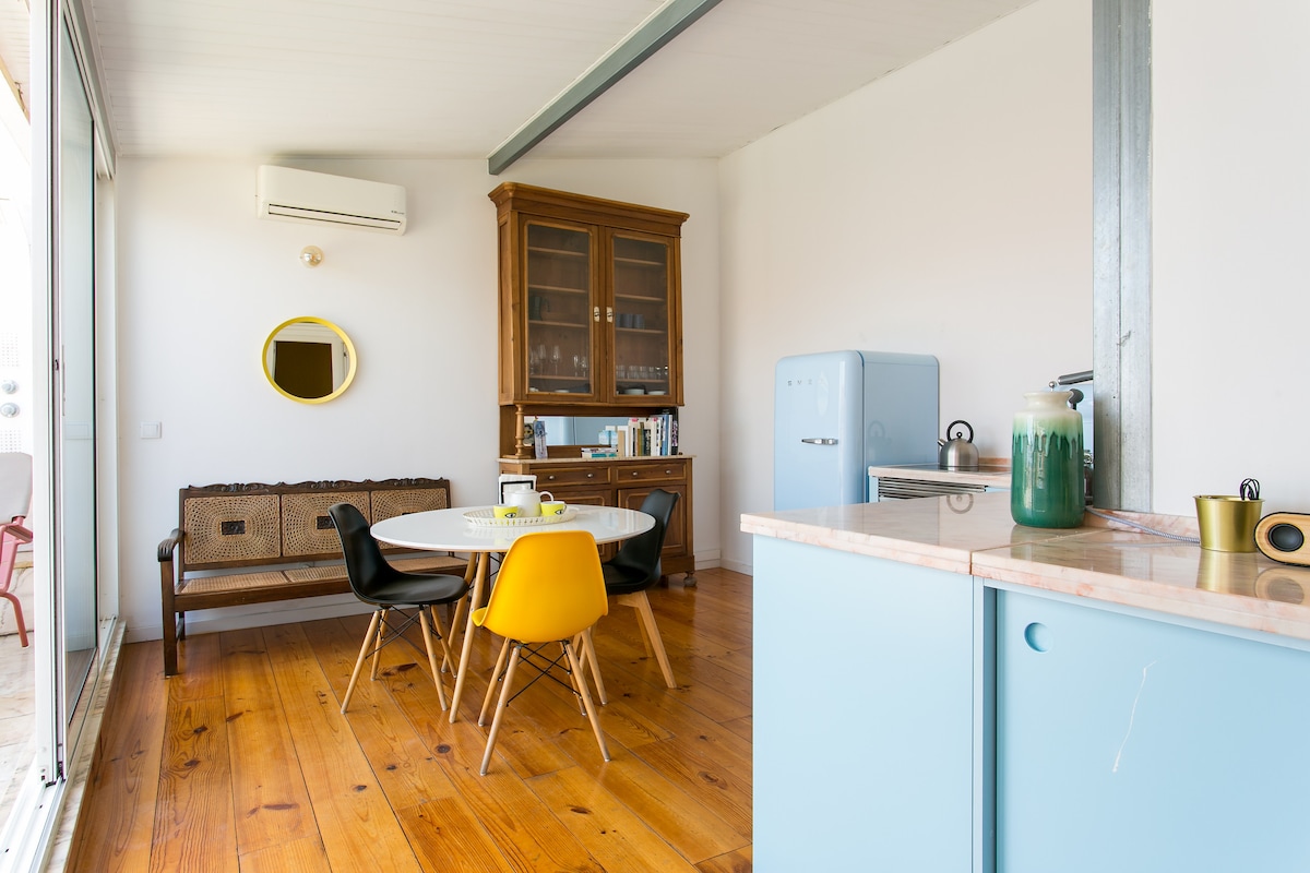 Een stijlvol appartement met 1 slaapkamer op het dak met een eigen terras en een prachtig uitzicht op het kasteel van Sao Jorge en de rivier de Taag. Gelegen in het hart van Lissabon, in Marques de Pombal dicht bij het karakteristieke park Eduardo VII en Avenida da Liberdade. ⚠️HOUD ER REKENING MEE dat er bouwwerkzaamheden naast de deur zijn en overdag luidruchtig kunnen zijn ** Het appartement op het dak is bereikbaar via een wenteltrap buiten. Houd er rekening mee dat dit appartement door de trap niet geschikt is voor personen met gereduceerde mobiliteit.