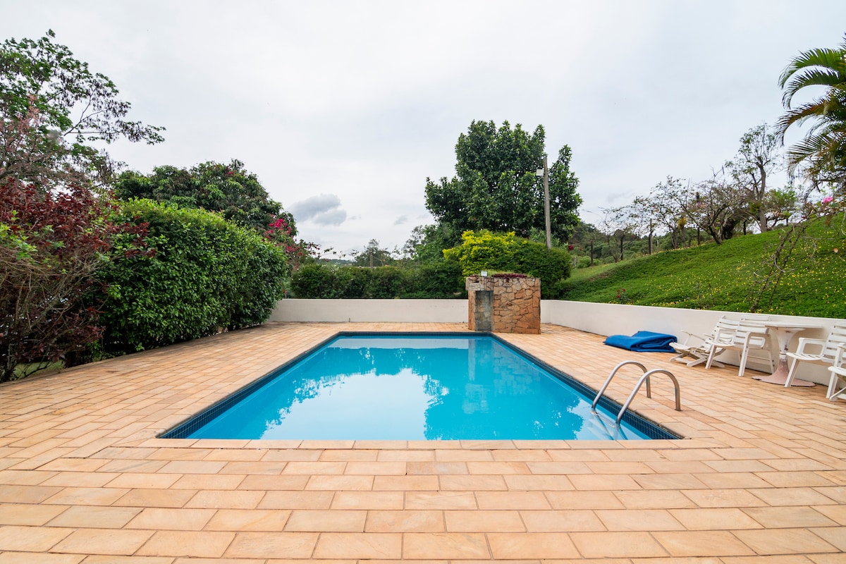 Linda chácara c 2 huizen, VERWARMD zwembad ( 32°, maar regen/troebel, kan -) ; quadra gras, zipline, barbecue, sauna, bevoorrecht uitzicht, dam om te vissen, bergklimaat. Nas 2 huizen bieden plaats aan 16 personen in bedden . P groepen c+ mensen zien waarde. Ik accepteer geen grote feesten en luid geluid. Van Claro's mobiele CWi-Fi. Er is geen bed-/kussenlinnen, maar huishoudelijk keukengerei. Er is 1 beveiligingscamera op het dak van 1 van de huizen. Met 7kw p elektrische autolader (apart in rekening gebracht).