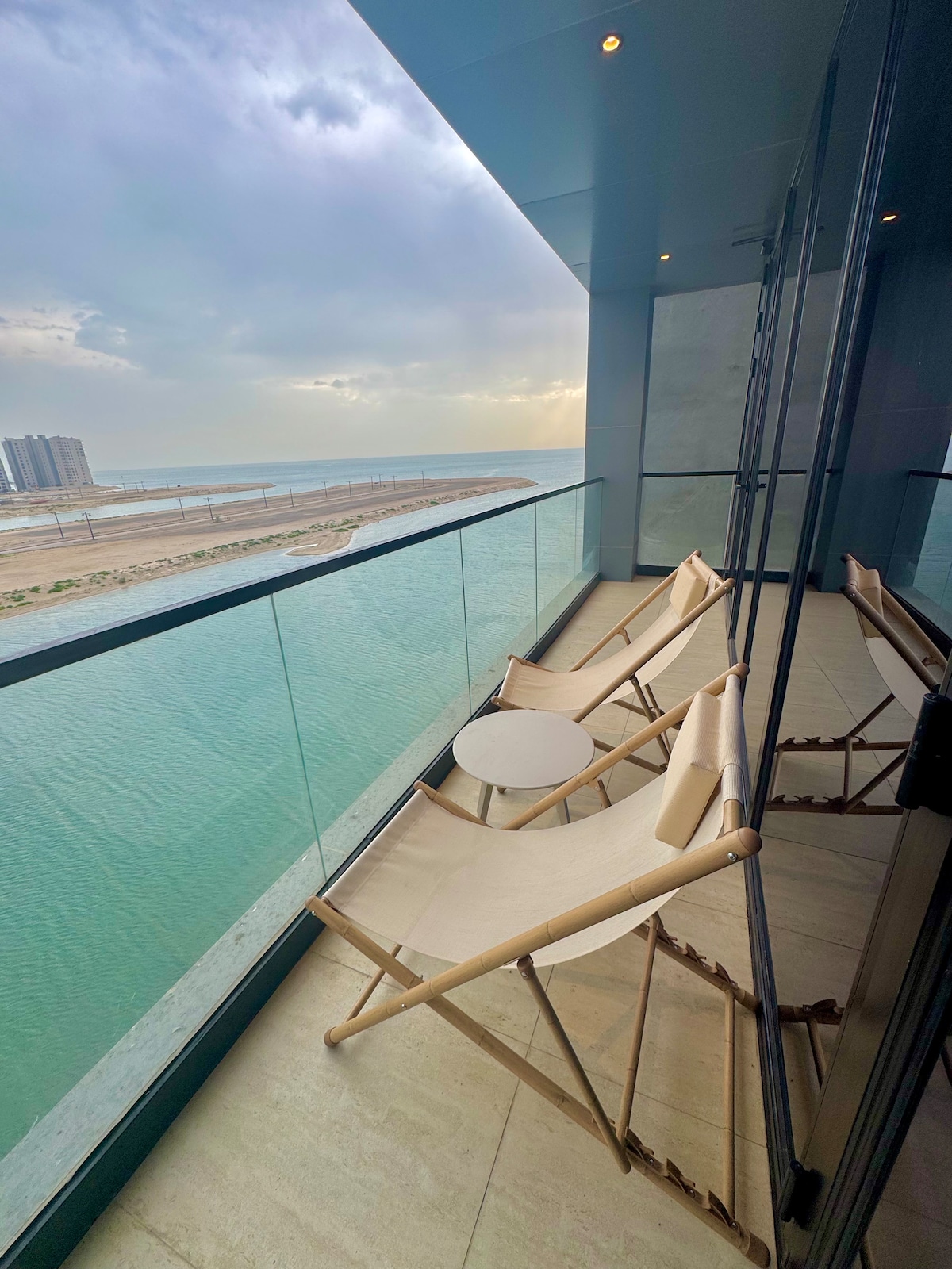 Bright, spacious studio with a relaxing sea view from the window, just 5 minutes from the Bahrain Causeway. King-size bed (180×200), comfortable sofa, and soft ambient lighting. 65” Smart TV with a movable mount, adjustable toward the bed. Fridge, microwave, and complimentary sachets. Fully equipped bathroom with fresh single-use towels, shampoo, shower gel, and hair dryer. Self check-in via smart lock with secure code. A clean and comfortable choice for guests seeking space & convenience.