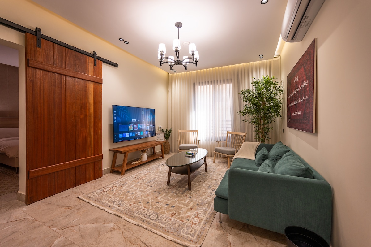 Geniet van een rustig verblijf in het centrum van Jeddah met een onderscheidend en charmant uitzicht, met een comfortabele sfeer en een vleugje luxe in je eigen accommodatie boven de stad in de buurt van alle bezienswaardigheden van Jeddah. De luchthaven ligt op 10 minuten afstand. Er is een 98-inch scherm voor bioscoop- en sportfans. Er is een groot bed en een comfortabele bank. Er is een prachtige buitensessie met Choi's tools. Voorzien van een ruime ruimte met volledige privacy met intelligente toegang. Fijn verblijf bij ons.
