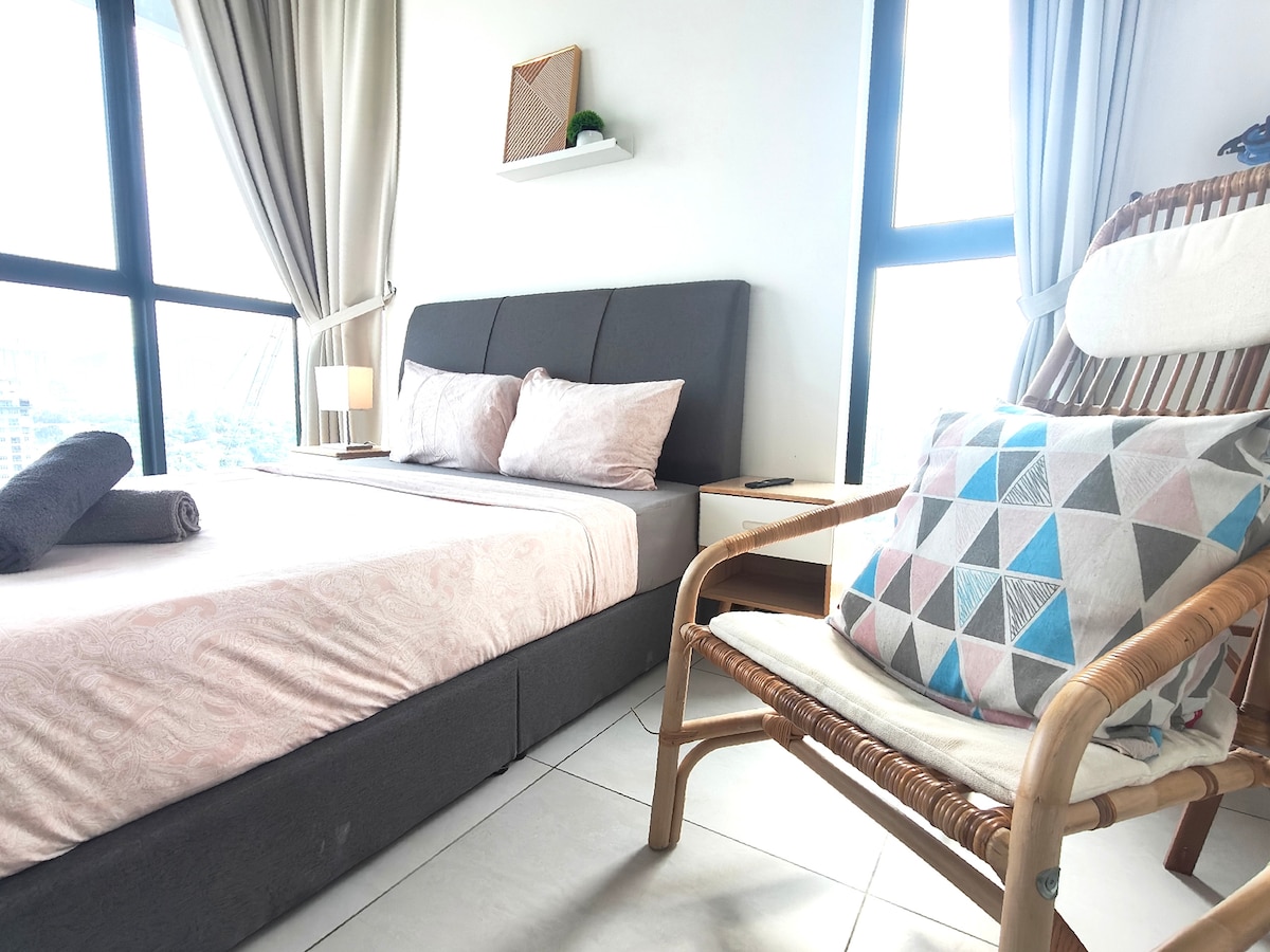 De allereerste homestay in Penang met massagestoel en SMEG koelkast. Een gezellig appartement met 2 slaapkamers in Urban Suites, genesteld tussen groen in het bruisende hart van Georgetown. De strategische locatie met lokale winkels en restaurants ligt op slechts enkele ogenblikken afstand. Meerdere toegangsroutes en loopafstand naar banken, markten, foodcourts & etc. State-of-the-art faciliteiten op niveau 42, bieden je een vogelperspectief op het architectonische wonder van Penang, de Penang-brug.