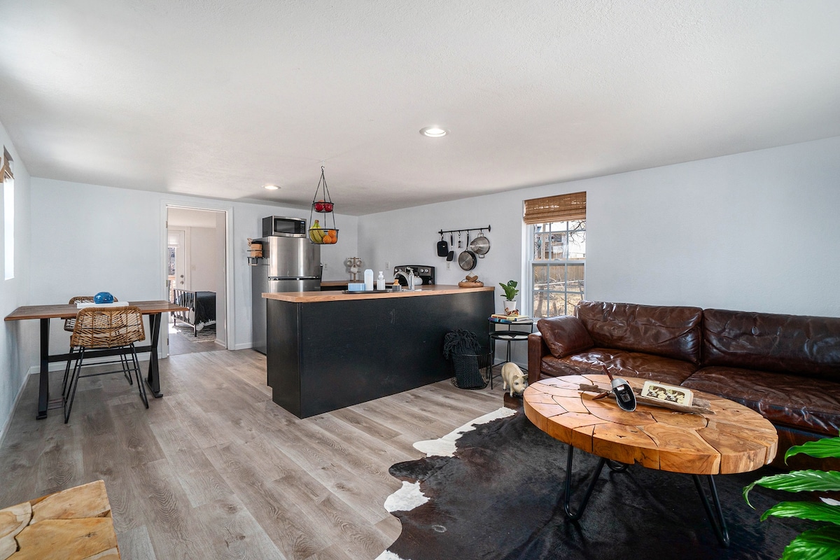 - Adorable house on large lot (not a guest house/cottage) -60 ft driveway - Separate bedroom with smart tv, queen size bed (comfy memory foam mattress) - Living room with 55" smart TV, leather sofa and additional seating - Fully equipped kitchen w/ eating area - Full bathroom w/ tub/shower - Washer/dryer - Table with leafs converts to great office area - Deck w/ outdoor seating and grill - 20 min from the Plaza, Westport and Downtown, 30 min from Lawrence, 40 min from the airport - $25 pet fee