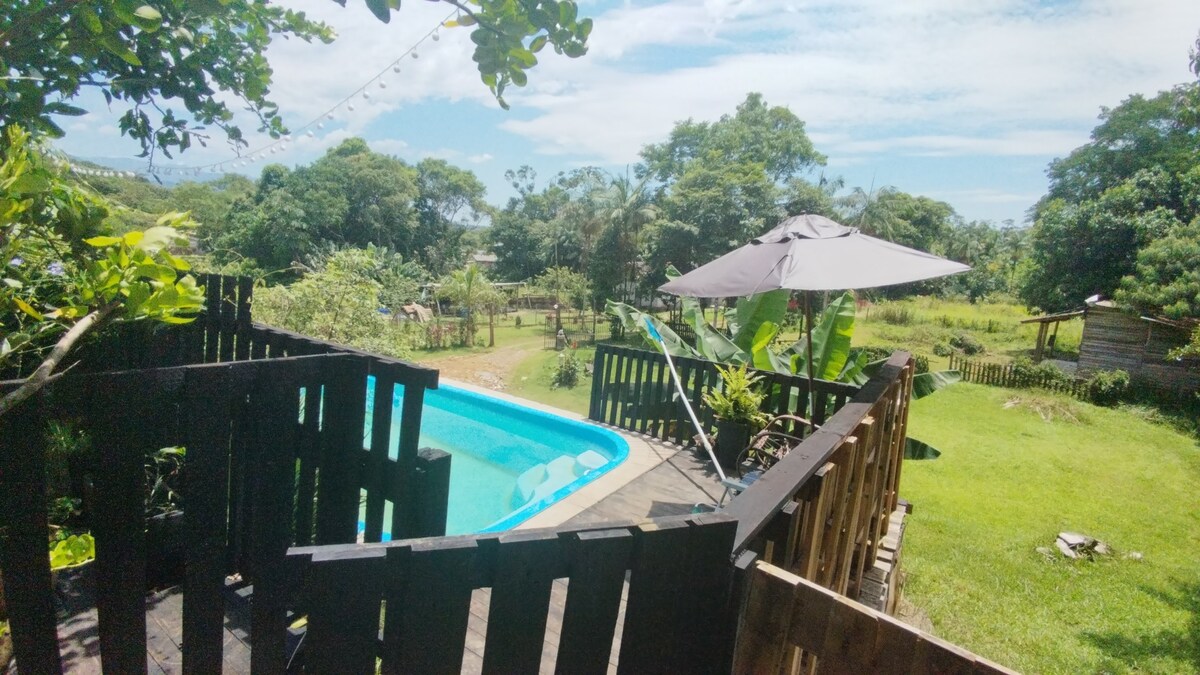 Stel je voor dat je wakker wordt met vogelgezang, verse eieren rechtstreeks uit het nest verzamelt en de dag eindigt rond een knetterend vuur onder een hemel vol sterren ✨ Ons gezellige kleine toevluchtsoord verwelkomt maximaal 5 gasten in 2 comfortabele slaapkamers. Het biedt een volledig uitgeruste keuken, een eigen badkamer en een terras voor maaltijden met uitzicht op de tuin en de bergen ⛰️ 🚗 Gratis parkeergelegenheid op het terrein en een bushalte direct voor de deur 🚌 📍 Naast BR-101, op 5 minuten van Expoville en op 12 minuten van het centrum van Joinville.