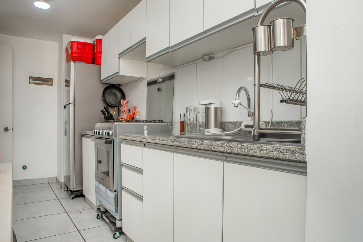 Dit moderne en gezellige appartement is perfect voor comfort en gemoedsrust. Geniet van een ruime en functionele ruimte met een ruime woonkamer om te ontspannen, twee televisies, een volledig uitgeruste keuken om heerlijke maaltijden te bereiden. Het heeft een comfortabele eetkamer en 2 moderne badkamers. Rustige omgeving, dicht bij Mall Aventura Plaza, 20 minuten van het centrum. De ligging is ideaal om Arequipa te verkennen terwijl je geniet van een sereen toevluchtsoord om uit te rusten.