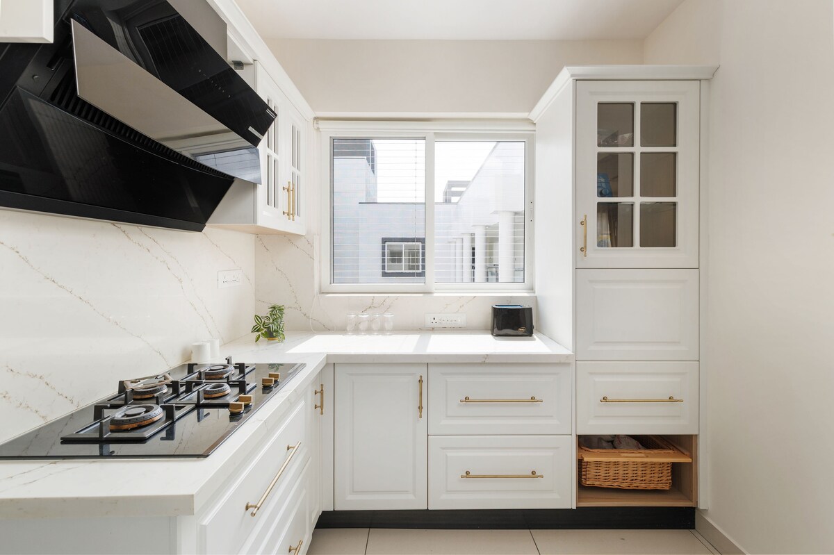 Welcome to our newly renovated, spacious 1-BHK flat, ideal for couples and families seeking comfort and convenience. The bedroom boasts a queen bed and soft orthopedic mattress for a restful night's sleep. Relax in the large living room with a 43-inch Smart TV, lightning-fast WiFi and dedicated workspace. Comes with a super clean bathroom stocked with essentials. The fully equipped kitchen includes basic ingredients, high-quality appliances, and crockery for your culinary adventures.