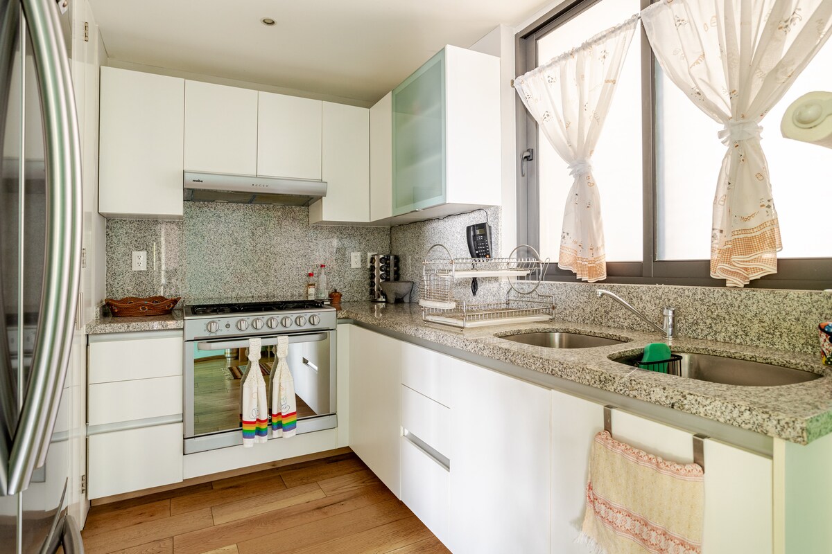 Geniet van de rust die dit appartement aan de achterkant in een pittoresk historisch gebouw levert. Geniet overal van de prachtige lokale kunstwerken en inrichting. Het moderne interieur is charmant en helder en biedt een dakraam en twee balkons. Geen lift. De accommodatie bevindt zich in een historisch gebouw, maar het appartement is volledig bijgewerkt, inclusief een complete make-over van de keuken en badkamer, met behoud van de charme en stijl van het gebouw. Deze achterste unit op de bovenste verdieping is rustig en kalm. Dakraam en 2 balkons zorgen voor daglicht. Vanwege de leeftijd van de accommodatie is er geen werkende lift. Kingsize bed, wasdroger, vaatwasser; kluisje; Mac-computer; Bose-luidsprekers voor iPhone; koffiezetapparaat; magnetron; waterkoker. En nieuwe, snellere internetservice. Ik woon in de omgeving. Ik zal beschikbaar zijn om gasten te ontmoeten en te verwelkomen bij hun aankomst, en beschikbaar tijdens hun verblijf voor vragen of aanbevelingen. Bohemien, kunstzinnig en eclectisch zijn gemeenschappelijke beschrijvingen van de Roma Norte, maar het is ook lommerrijk, residentieel en bijna Europees van smaak. De boulevards, parken, pleinen en cafés die de omgeving accentueren, zijn perfect om te voet of met de fiets te verkennen. Het is heel praktisch om je te verplaatsen in dit deel van de stad, je kunt fietsen; je kunt lopen; je kunt de metro of de metrobus nemen.