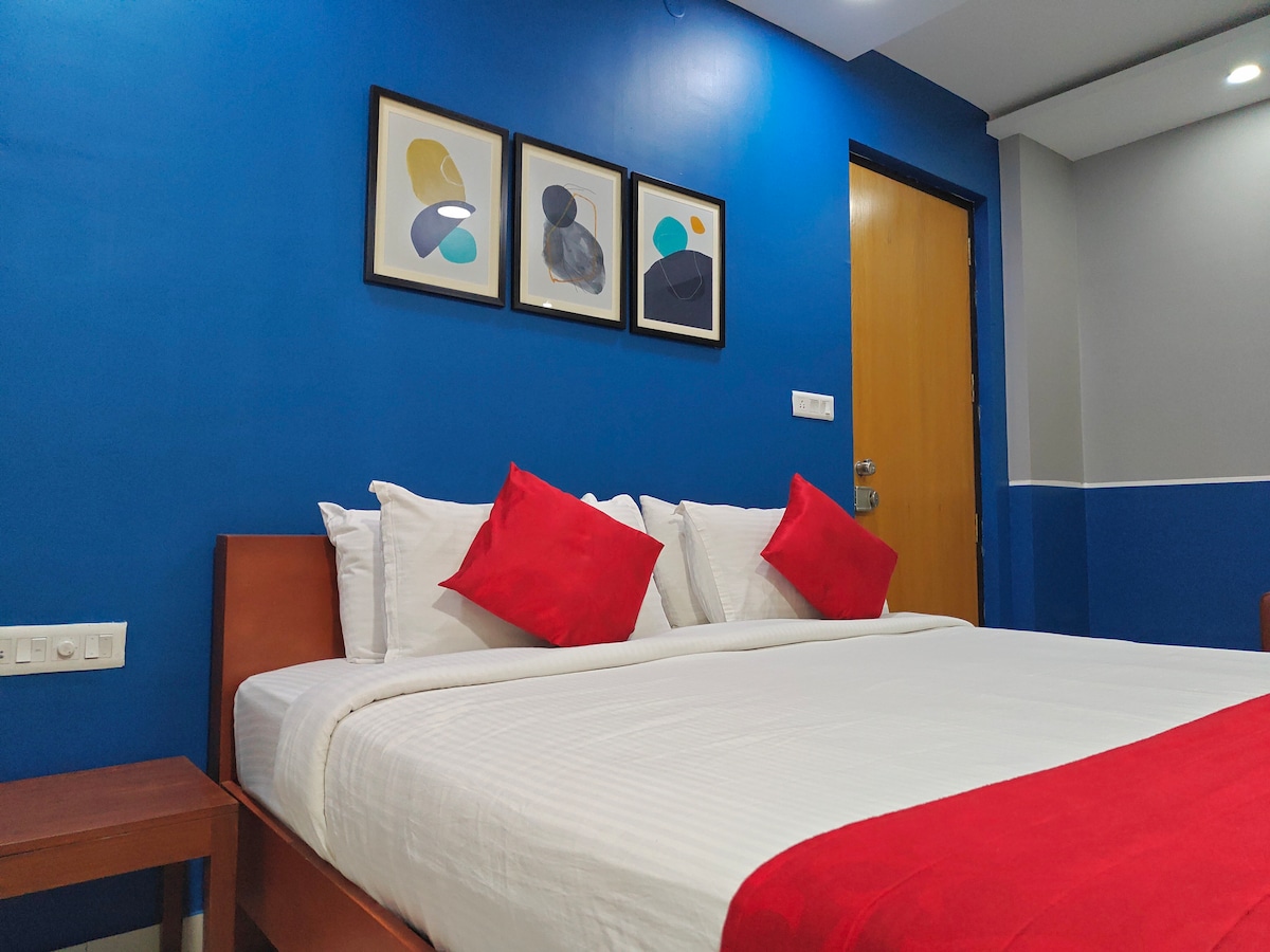 BLUO BLIJFT - Bekroonde Woningen! Nieuw gebouwde designstudio voor alleenstaanden/koppels die werken in Gachibowli, Hitech City, Jubilee Hills, op 5 minuten van het AIG-ziekenhuis . Privéstudio heeft een queensize bed, een bureau, een flatscreen-tv, een bank in de badkamer, een balkon en een volledige keuken met fornuis, een koelkast, een magnetron, kookgerei, enz. Accommodatie met terras, tuin, lift en parkeerplaats. All-inclusive dagelijks tarief - wifi-internet, Netflix/Tatasky, schoonmaak, wasmachine, nutsvoorzieningen, parkeren, 100% stroomback-up