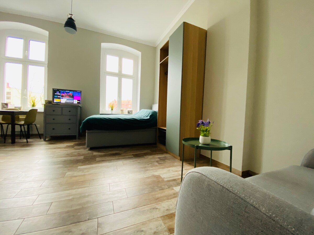 Het appartement bevindt zich op de eerste verdieping van een gerenoveerd herenhuis; in een rustige, groene wijk van Bytom. Gasten hebben toegang tot: een ruime kamer met twee bedden en een werkplek, een volledig uitgeruste keuken met eetkamer, een badkamer met toilet en een hal. In de buurt zijn winkels en bushaltes met directe verbindingen naar Tarnowskie Góry, Zabrze en Bytom. 5 minuten rijden naar de dichtstbijzijnde oprit naar de snelweg A1. 20 minuten naar de luchthaven in Katowice-Pyrzowice.