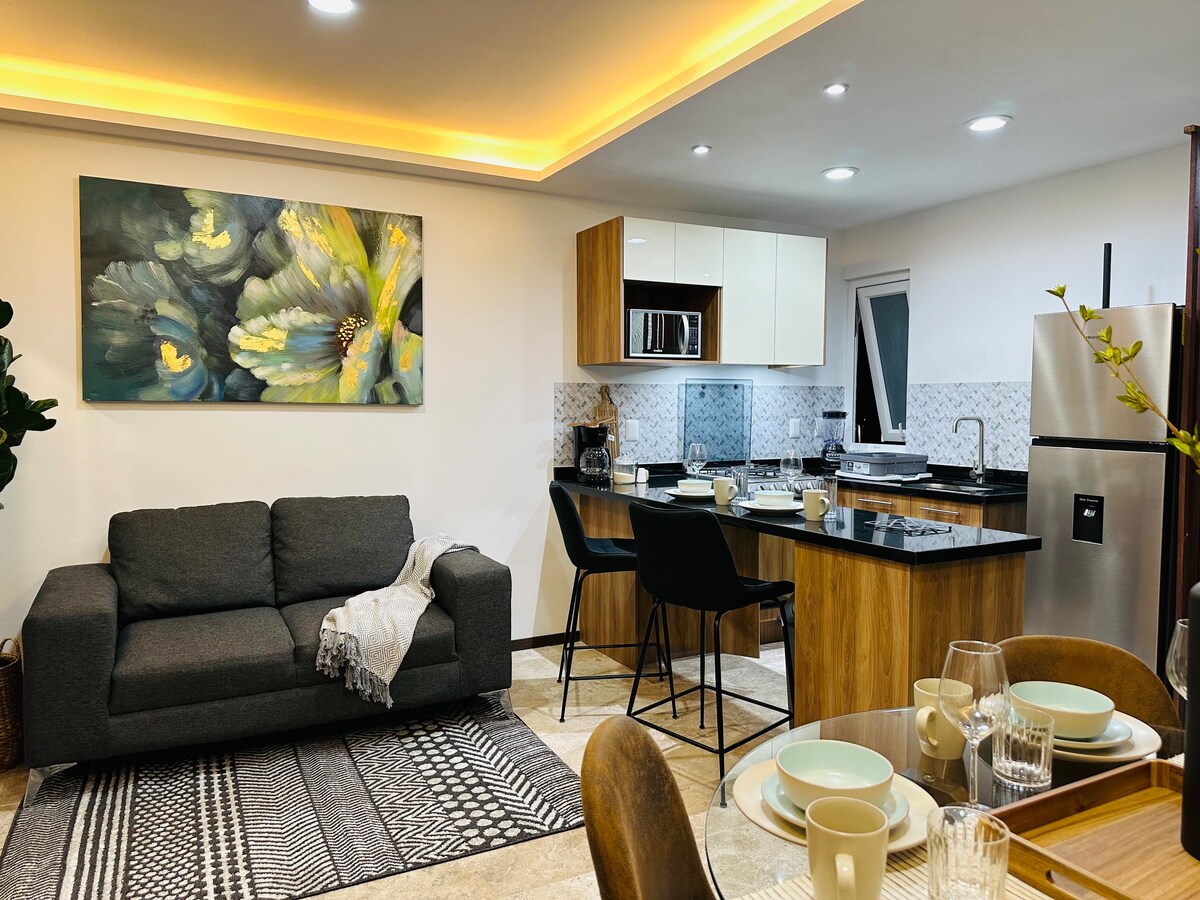 Modern appartement met één slaapkamer met alles wat je nodig hebt om te wonen Een tweepersoonsbed en in de woonkamer een slaapbank voor twee personen Wifi, volledig servies, tv met Roku, koelkast, magnetron, wasmachine en droger, strijkijzer, enz. Het beste is de locatie; bij de ingang van Juriquilla, op loopafstand van verschillende restaurants, supermarkten en winkels