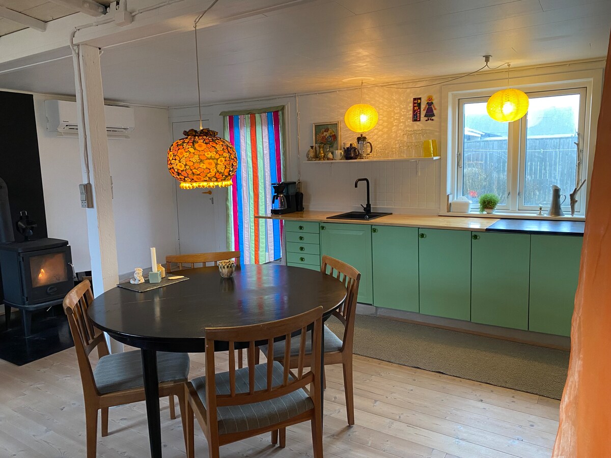 Klein gezellig, rustiek huis in directe verbinding met de kas. Het huis is een bijgebouw van onze rietgedekte woning die zich in een bosrijke omgeving op het zuiden bevindt Omgeven door een grote tuin. Het huis heeft een tweepersoonsbed, een bank en een salontafel en een ladder naar een kleine zolder. Het huis wordt verwarmd met een houtkachel, brandhout inbegrepen. Eenvoudige keukenfaciliteiten, maar het is mogelijk om een warme maaltijd te bereiden. Toilet en badkamer in het hoofdgebouw, direct bij de ingang van het pension. Toilet en bad gescheiden, gedeeld met het gastheerpaar. Het huis is prachtig gelegen, dicht bij de fjord, de zee, het Nationalpark Thy