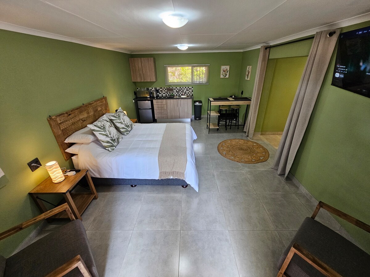 Gezellige flat met Queen XL bed, badkamer, keuken en kleine tv-hoek met leren bank. Gratis wifi. Geen lastverlies door onvoorziene stroomvoorziening. Zeer goed gelegen dicht bij het centrum van Nelspruit, de luchthaven KMIA, N4 en eersteklas restaurants. Op 250 meter loopafstand van het dichtstbijzijnde best beoordeelde restaurant. Geniet van de rust van de natuur en wandelingen in de middag op een veilig landgoed. Ideaal voor zakenreizen of easy going persoon op zoek naar de ontspannende rustige omgeving dicht bij golfterrein.