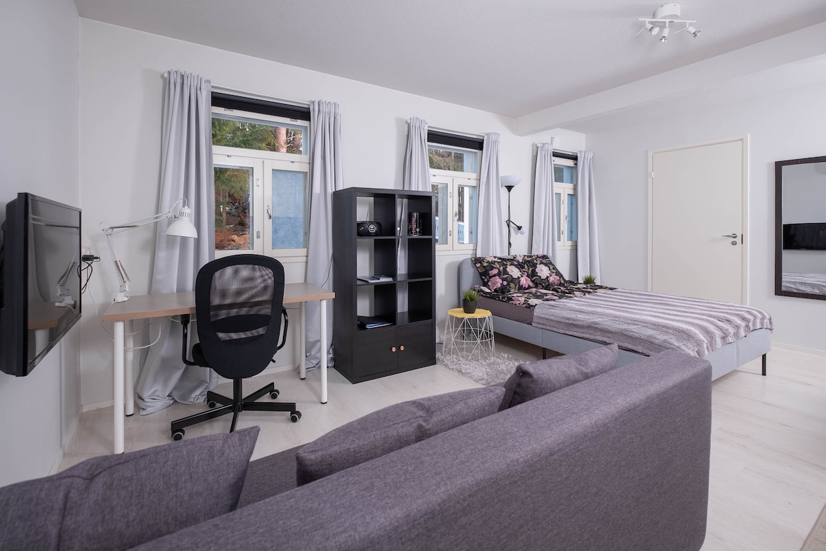 Een rustige en goed uitgeruste studio in Kuopio's Saaristokaupunki, aan het einde van een rustige straat met volledige privacy. Omgeven door bos aan verschillende zijden en dicht bij het Kallavesimeer, met geweldige mogelijkheden voor ontspannende wandelingen en natuuractiviteiten. • 28,5 m², eigen ingang en slim slot • Volledig uitgeruste keuken • Wasmachine en strijkspullen • Werkruimte, snelle wifi, tv + Chromecast • Overdekt terras en grill • Gratis parkeren en 11 kW EV-oplader (vermogen is afhankelijk van de belasting)
