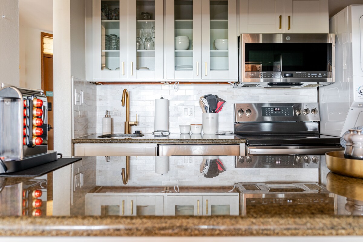 Begane grond, onderste hoek tegenover Cove Beach — dicht bij zonsondergang op het strand, surfen, foodtrucks en lokale winkels. De enige unit met een tandemparkeerplaats direct naast je muur en achteringang. Stap uit je auto, loop rechtstreeks naar je slimme veiligheidsdeur op je eigen achterdek. Volledig geüpgraded met snelle wifi, twee airconditioningunits, nieuwe apparaten en een lavastenen douche met hete/sterke druk. Slaapplaatsen voor 4 personen met een master + studio, strandspullen, goed gevulde keuken en schoon linnengoed.