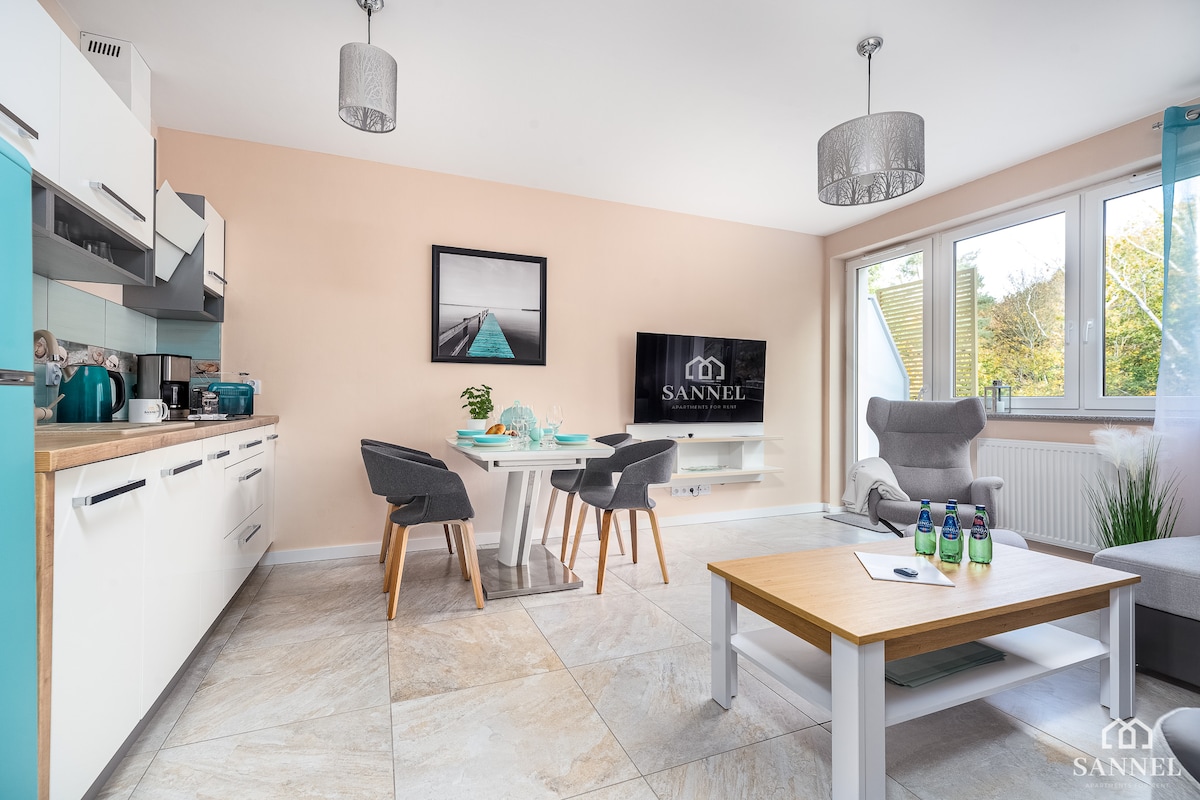 Wij bieden je een appartement met een kitchenette en een balkon, een badkamer met een douche en een gang. Geweldige locatie - 300 m naar het strand, 500 m naar de pier. Een uitstekend appartement voor een gezin. Voor het appartementencomplex is er ook een ingang naar het prachtige Wolin National Park. Zeer rustige buurt. Volledig uitgerust appartement. In het appartement is één kamer verbonden met de keuken en de badkamer.