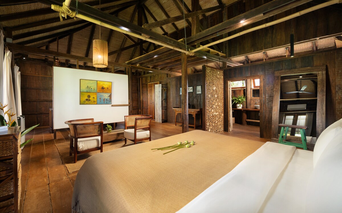 Deluxe Bungalow Suite | Khmer Traditioneel Huis Ervaar het rustige leven in deze prachtig vormgegeven bungalow met één slaapkamer, een eigen badkamer met bad, een gezellige woonkamer, een volledig uitgeruste keuken en een ruim balkon. Deze suite is gebouwd in traditionele Khmer-stijl en biedt modern comfort in een charmant dorp. Perfect voor koppels die op zoek zijn naar een serene ontsnapping.