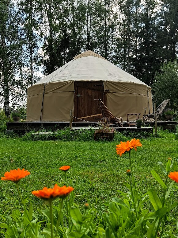 Een sfeervolle en gezellige joert is de perfecte ontsnapping aan het dagelijks leven, in de natuur. De ruime, handgemaakte yurt is comfortabel ingericht en als je wilt, kun je ook ontspannen in de yurtsauna (geen extra kosten). De wasplaats bevindt zich onder een kruikboom, prachtig beschermd door wilgenhekken. De verblijfjurt heeft een houtkachel waarmee je de joert kunt verwarmen en bijvoorbeeld thee- of koffiewater kunt koken. 's Ochtends brengen we het ontbijt naar de yurt. "Glamping op zijn best!"