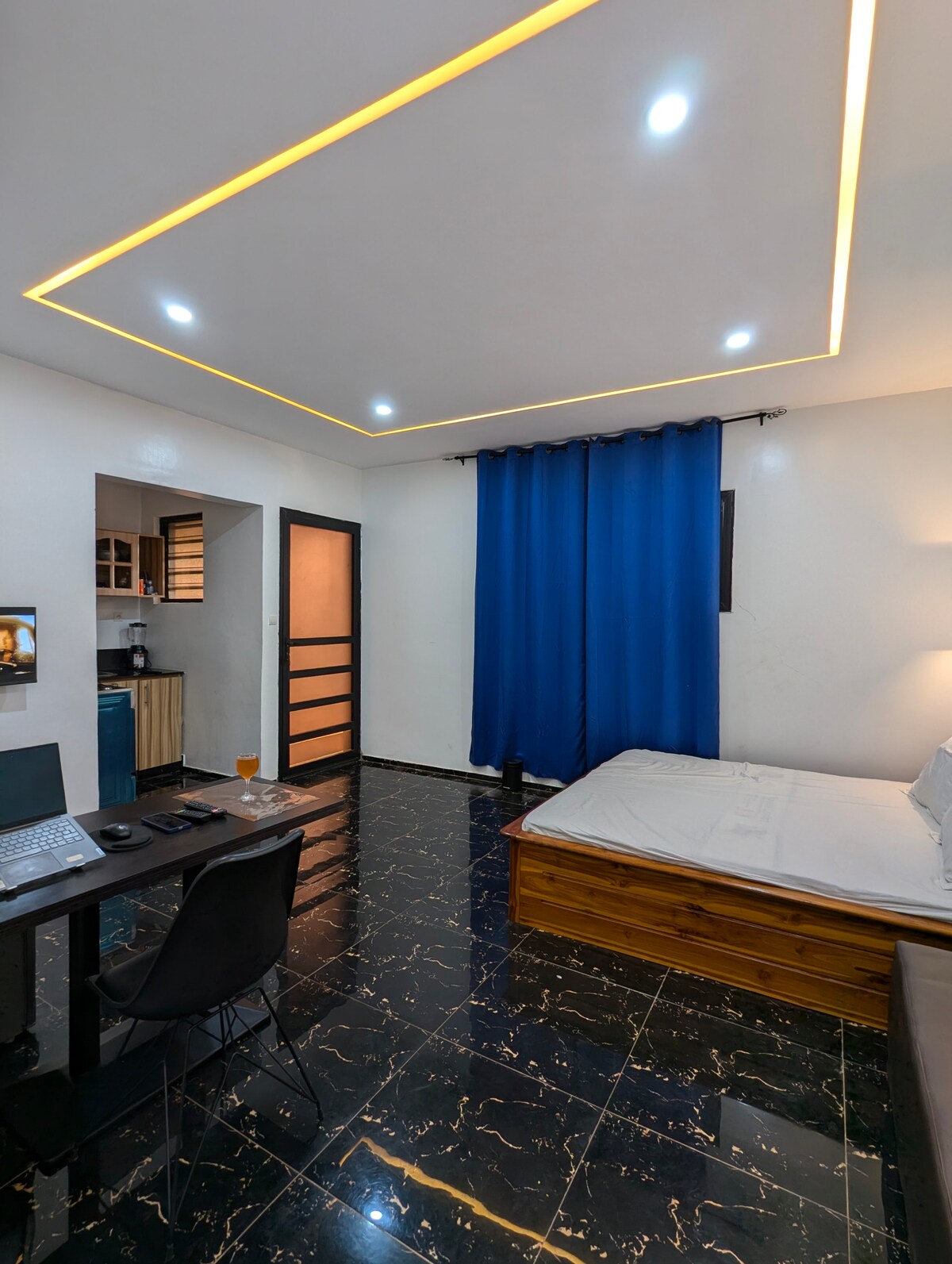 Deze chique woning gelegen in Lama-Kpédah op 5 km van het centrum van Kara biedt je een unieke leefomgeving in comfort, moderniteit en sereniteit voor een rustig en veilig verblijf. GEMEUBILEERD APPARTEMENT van 70 m2 Woonkamer Eethoek Aangesloten 65 inch flatscreen-tv 01 groot bed (190 x 210) 01 dubbele schommelgarderobe 01 Gemengd fornuis (gashaarden aanwezig en inductiekookplaten) Hoogwaardig keukengerei en bestek 01 210 liter koelkast