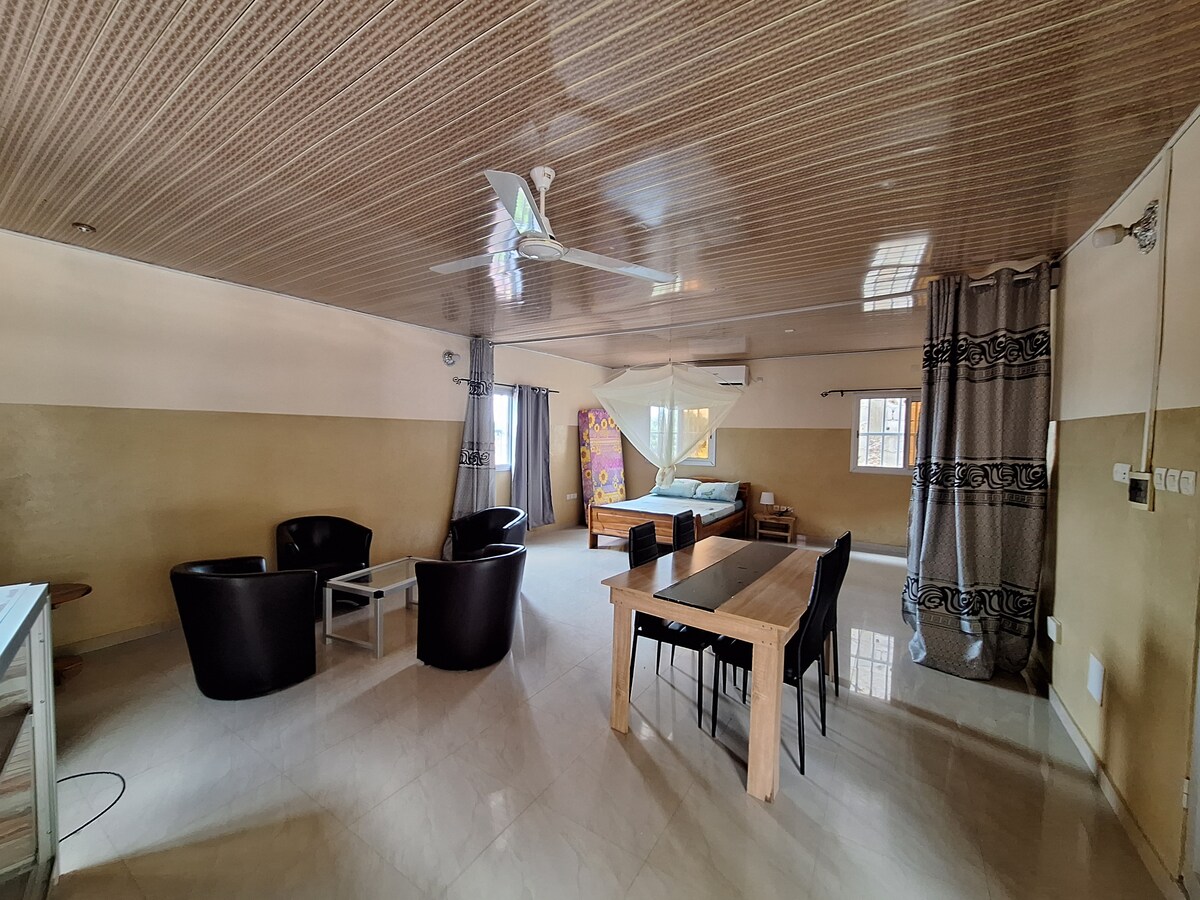 Mooie, gemeubileerde villa met ondergrondse garage. Zeer chique en comfortabel gelegen in Sokode, het centrum van Qt. Kossobio. Voor vakanties, lessen en een langer verblijf. Mogelijkheid tot het huren per kamer. Woonkamer, keuken, terras goed geventileerd en ruim. 3 slaapkamers inclusief een met interne douche toilet + douche toilet en toilet. Keuken met gasoven, vriezer, magnetron, kookgerei. Rustig en aangenaam verblijf gegarandeerd.
