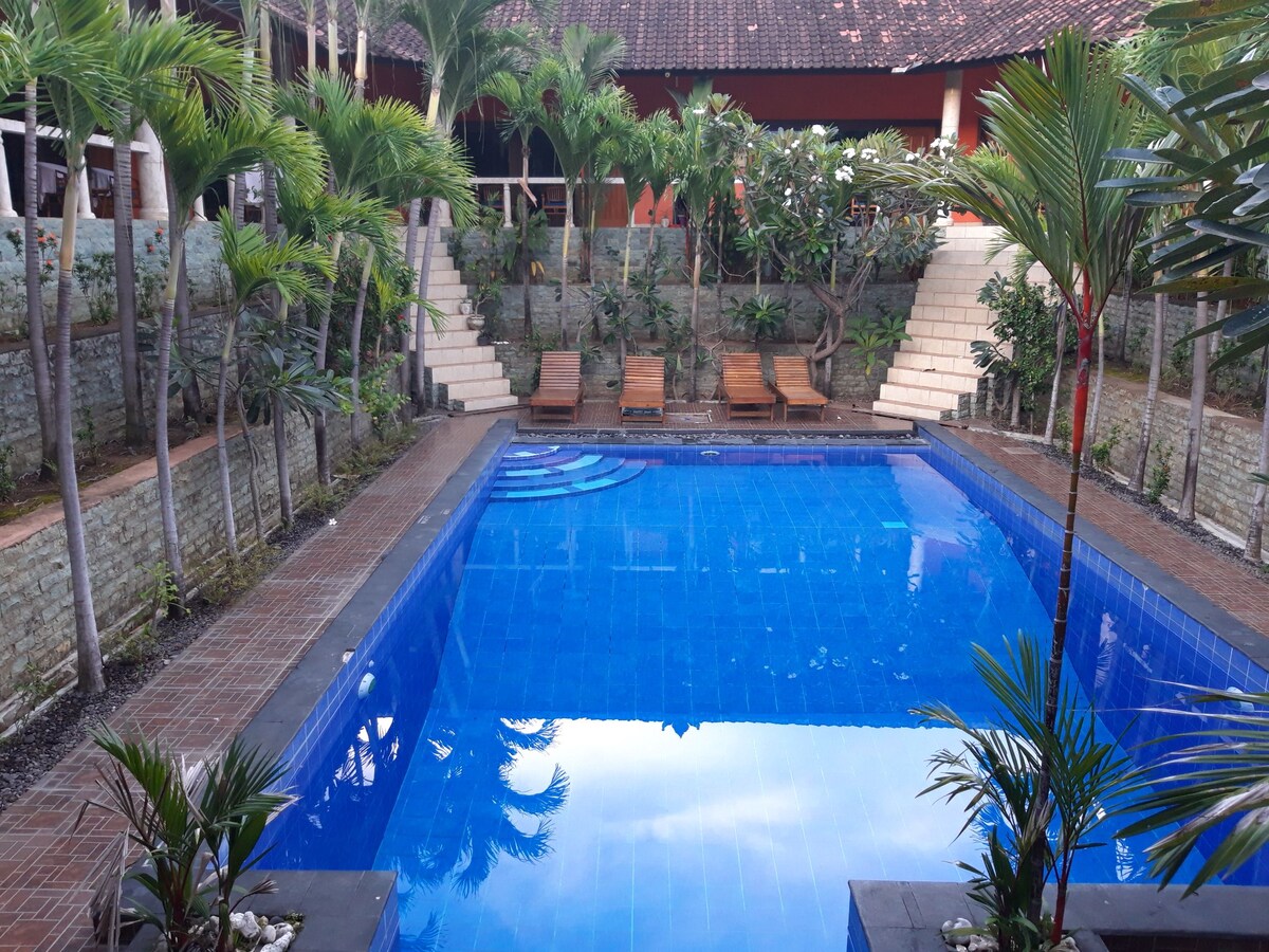 deze kamer ligt op 700 meter van het strand , uitzicht op de berg Agung , het zwembad en de tuin bevinden zich in de accommodatie . de kamer heeft een eigen keuken en woonkamer. keukenfaciliteit : compleet keukengereedschap , staande oven , waterdispenser , rijstkoker , bar , ventilator. Kamervoorziening: Kingsize bed, airconditioning, tv, kledingkast, droogrek voor kleding. Toilet: warme/koude douche, natte kleding ophangen, kaptafel. We hebben ook diensten geleverd: Gidsen Taxi Makelaar