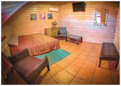 De accommodatie die we aan gasten bieden, is een traditionele mazanka-hut, maar met alle moderne voorzieningen. Het interieur en de hele ruimte van het landhuis is een levende handgemaakte creatie gemaakt van hout en klei. Hout in het interieur kan elke ruimte kalm, ontspannend en zelfs meditatief maken. Het absorbeert overvloedige energie, woede en angst en herstelt het natuurlijke evenwicht van lichaam en geest. En klei, een natuurlijke genezer, geeft een helend effect. Er is een houtgestookte saunabaden.