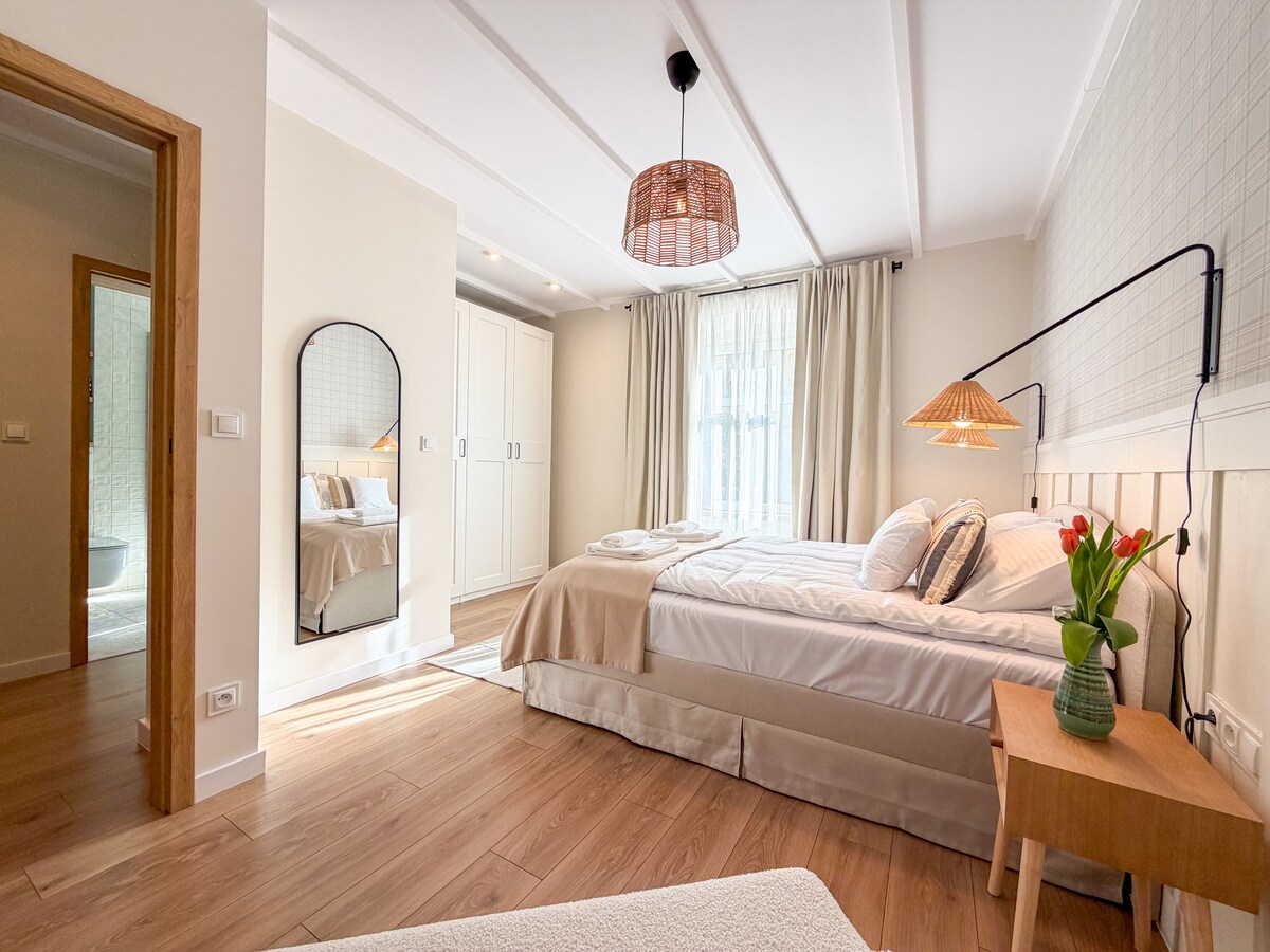 Het appartement is ingericht in een Scandinavische stijl — licht, kalm en bevorderlijk voor rust. Hier vind je een gezellige ruimte waar natuurlijke materialen en zacht licht een rustgevende sfeer creëren vanaf de voordeur. Het interieur is volledig uitgerust om je verblijf comfortabel en zorgeloos te maken, met behoud van een huiselijke sfeer: je kunt je ochtendkoffie drinken bij een groot raam, gaan zitten met een boek, een maaltijd bereiden of gewoon ontspannen na een actieve dag.