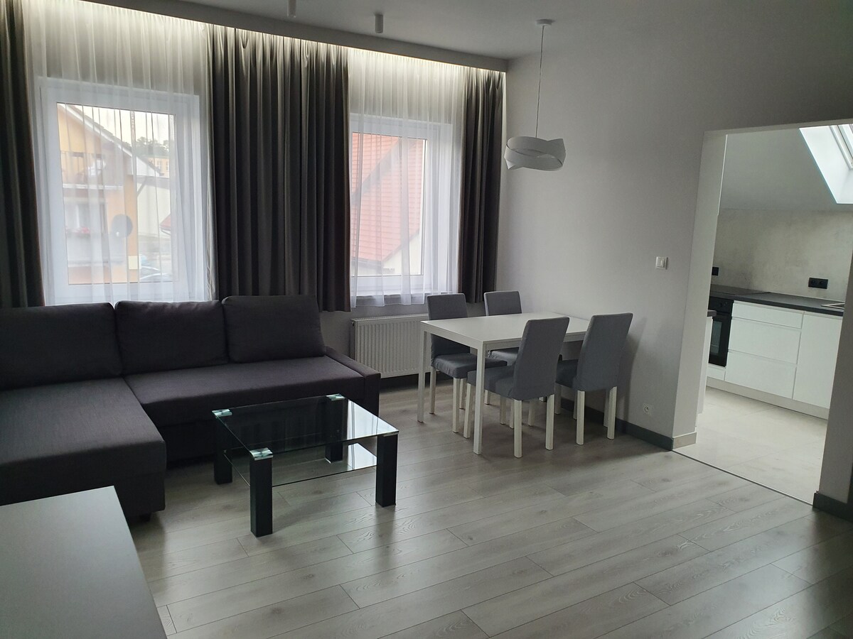 Het appartement ligt op de eerste verdieping en biedt plaats aan 4 personen. De slaapkamer heeft een comfortabel tweepersoonsbed en de volgende twee bedden bieden een comfortabele slaapbank in de woonkamer. Het appartement is voorzien van alle benodigde apparaten: comfortabele keuken met inductie kookplaat, oven, vaatwasser, broodrooster, waterkoker. In de badkamer vind je een haardroger en een wasmachine-droger. Het appartement is gelegen in de nabijheid (210 m) van de spa en Noorse parken.