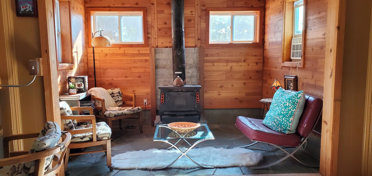 Ontsnap naar onze gezellige hut, het perfecte toevluchtsoord voor koppels en hun harige metgezellen. Ontspan met een drankje aan de cocktailbar (neem je favoriete sterke drank mee), ontspan in hangmatten onder de bomen of verzamel je rond de vuurplaats onder de sterren. Geniet van een volledig uitgeruste keuken, wasserette en een koffiebar om je ochtenden te beginnen. Gelegen op minder dan 20 minuten van Sleeping Bear Dunes, Traverse City en Fish Town, biedt onze hondvriendelijke haven rust en avontuur in gelijke mate.