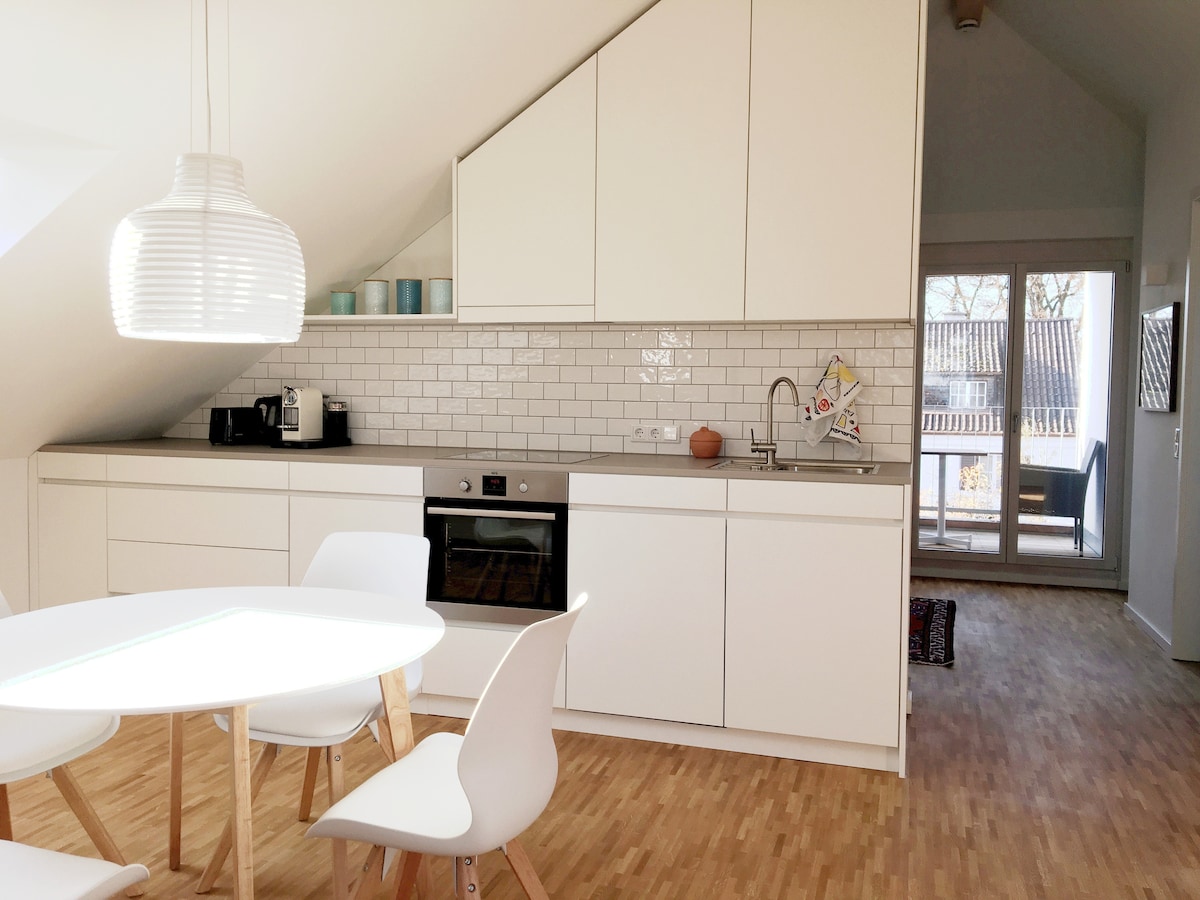 De loft is gelegen in Dachau-Süd, dichtbij het stadspark en ASV sportfaciliteit. Winkels, station en stadscentrum liggen op loopafstand van winkels, station en stadscentrum. Het is een wooneenheid met een eigen ingang, die nieuw is gebouwd tijdens de modernisering van het dak in 2019. Kenmerkend is een open interieur met hoge muren, lichte kamers en een wenteltrap die van buitenaf toegang geeft. Tijdens je reservering heb je alleen toegang tot het appartement