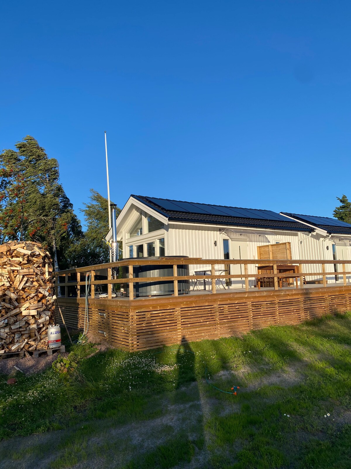 Eigen huisje van 52 m2 + 25 m2 zolder en groot terras met buitenbubbelbad voor 6 personen. Zeer moederlijke en mooie accommodatie voor uzelf met de gastheer in zijn eigen huis op het terrein. Eigen parkeerplaats met ruimte voor 3 auto's. Direct verbonden met het Vänernmeer en 12 km rijden naar het grote plein in Karlstad. Een kleine eik met elektrische motor is beschikbaar indien gewenst. Als u uw eigen boot bij u heeft, kunt u deze bij de steiger leggen. In de zomer kunt u een kleinere boot met elektromotor lenen (zie foto)
