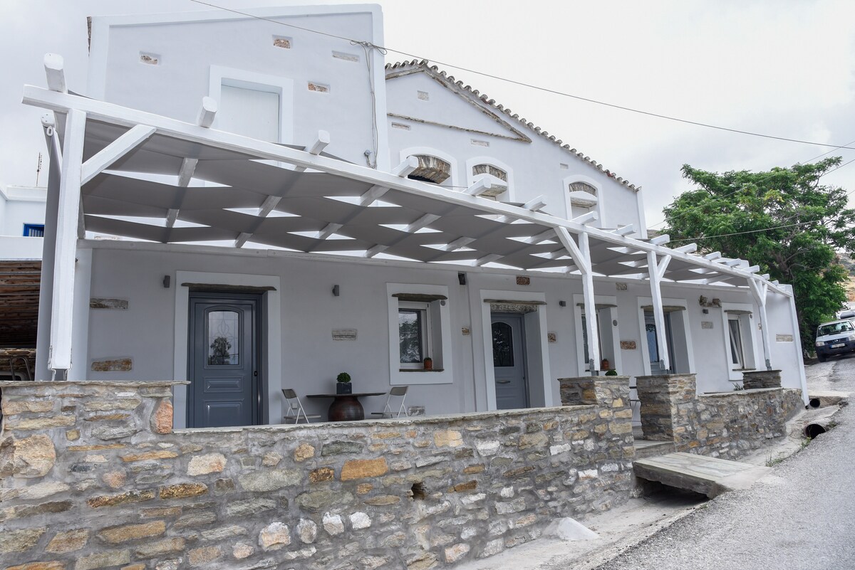 Cycladisch huis dat balanceert tussen traditioneel en modern, ideaal voor uitstapjes voor twee personen. Het combineert wit met de steen van Tinos, waardoor een sfeer van ontspanning en zorgeloosheid ontstaat, als gevolg van de minimalistische esthetiek. Het ligt op 20 minuten rijden van de haven van Tinos en op 10 minuten rijden van het strand van Kolimbithra, en de locatie in het centrum van het eiland maakt het ideaal als startpunt voor een veelbelovende verkenning!