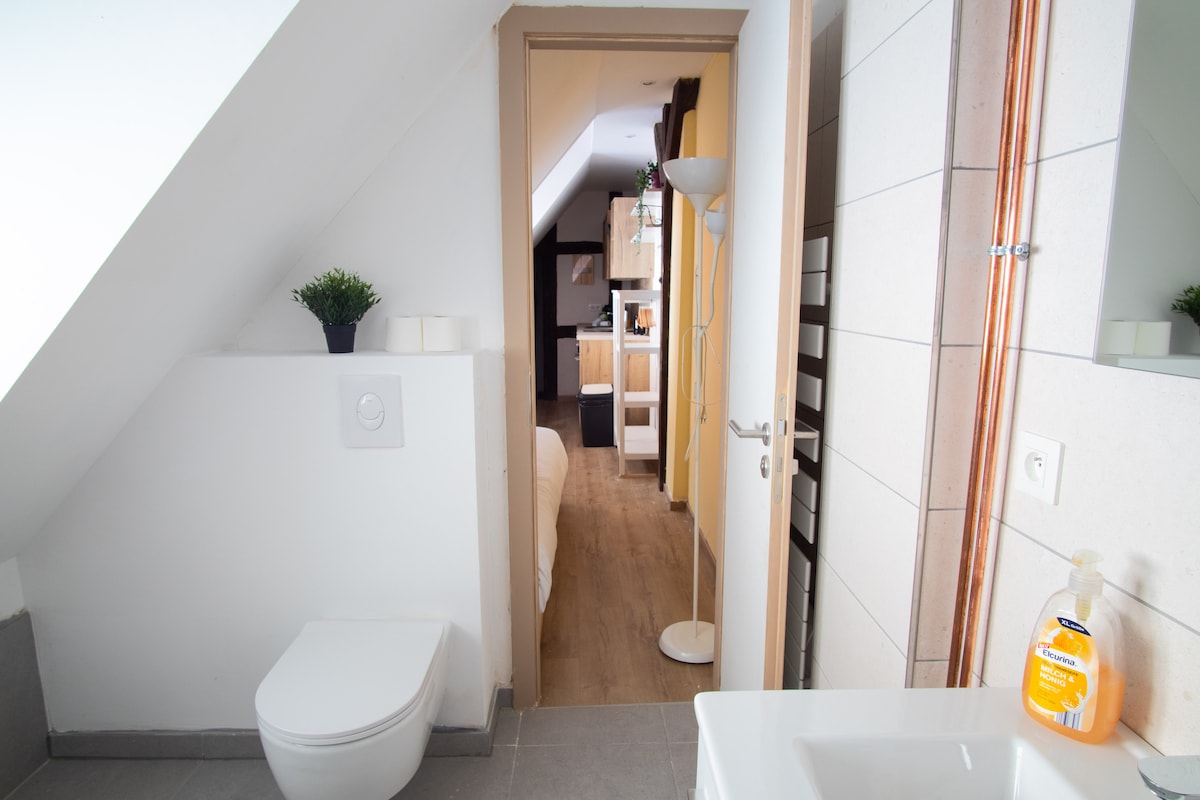 In de fijne buurt van Old Cronenbourg, op 2 minuten van de tram Saint Florent, gloednieuwe studio met echt slaapgedeelte. Houd er rekening mee dat de studio niet geschikt is voor mensen met beperkte mobiliteit, zolang je een trap moet beklimmen om er toegang toe te krijgen, je moet naar beneden buigen bovenaan de trap (balk) en het slaapgedeelte is alleen toegankelijk via een kleine ladder (foto). Accommodatie op tien minuten van het historische centrum met de tram!