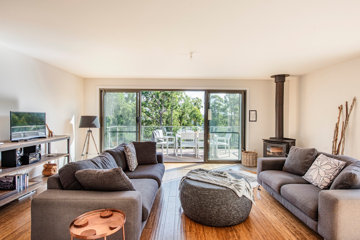 Boutique appartement, houten vloeren, houtkachel, SmartTV, onbeperkte NBN WiFi, keuken met oven, kookplaat, koelkast, magnetron, koffiepadmachine, slowcooker enz. Kingsize bed in de slaapkamer, bank in de woonkamer. Moderne badkamer met vloerverwarming, vrijstaand bad + douche. Spectaculair uitzicht rond het pand van de heuvels en bergketens aan 2 zijden. Dek, prachtige tuinen, zithoeken & bbq 's op 6 hectare. Vriendelijke dieren. Geniet van de rust en stilte van onze Hideaway