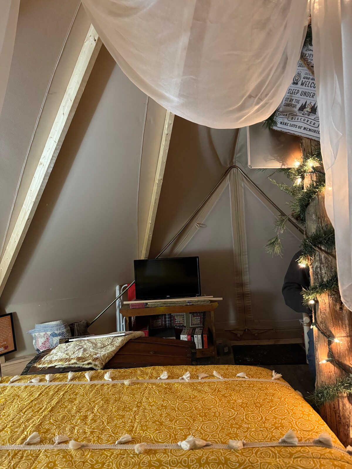 De vredige ligging van deze op maat gemaakte tent en bijgebouw van canvas zal je niet gauw vergeten. Veel tijd en hard werk zijn besteed aan het creëren van een prachtig, maar eenvoudig en vredig uitje voor koppels/vrienden/familie. Geïnspireerd door de liefde en waardering van de eigenaar voor vintage meubels, souvenirs en oude klassieke muziek/media, is onze hoop voor degenen die een kleine plek willen om te verblijven, en iets anders willen, zullen ons bekijken. Het is nog steeds een werk in behandeling met nog veel meer!