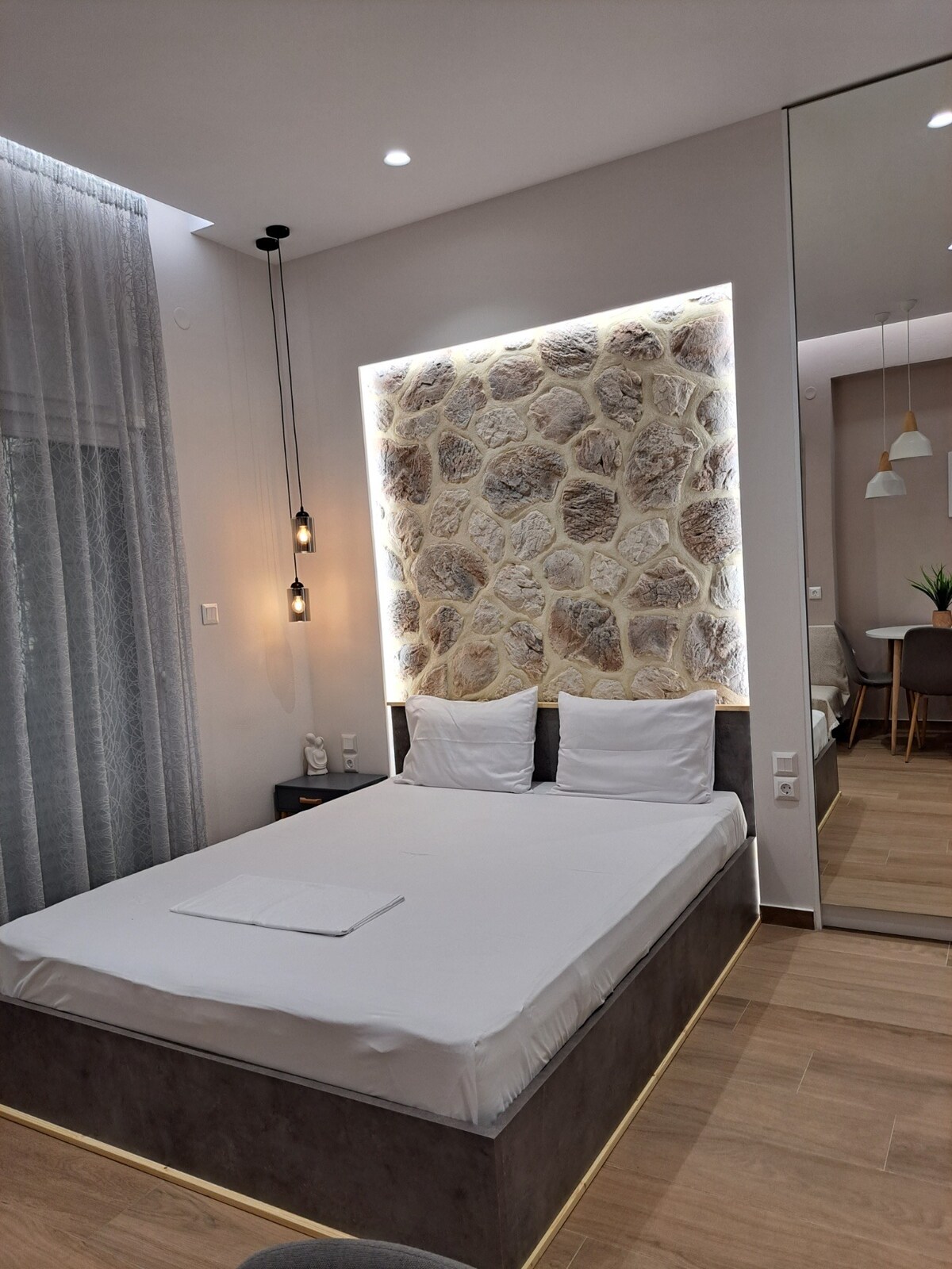 Πρόκειται για ένα καινούριο διαμέρισμα, προσανατολισμένο στην άνεση των επισκεπτών του, ιδανικό για ζευγάρια και επαγγελματίες. Βρίσκεται στο κέντρο της πόλης, με θέα τη θάλασσα και το Πήλιο. Απέχει μόλις 1 λεπτό από την παραλία, 3 λεπτά από την προβλήτα του λιμανιού και 2 λεπτά από την Ερμού.