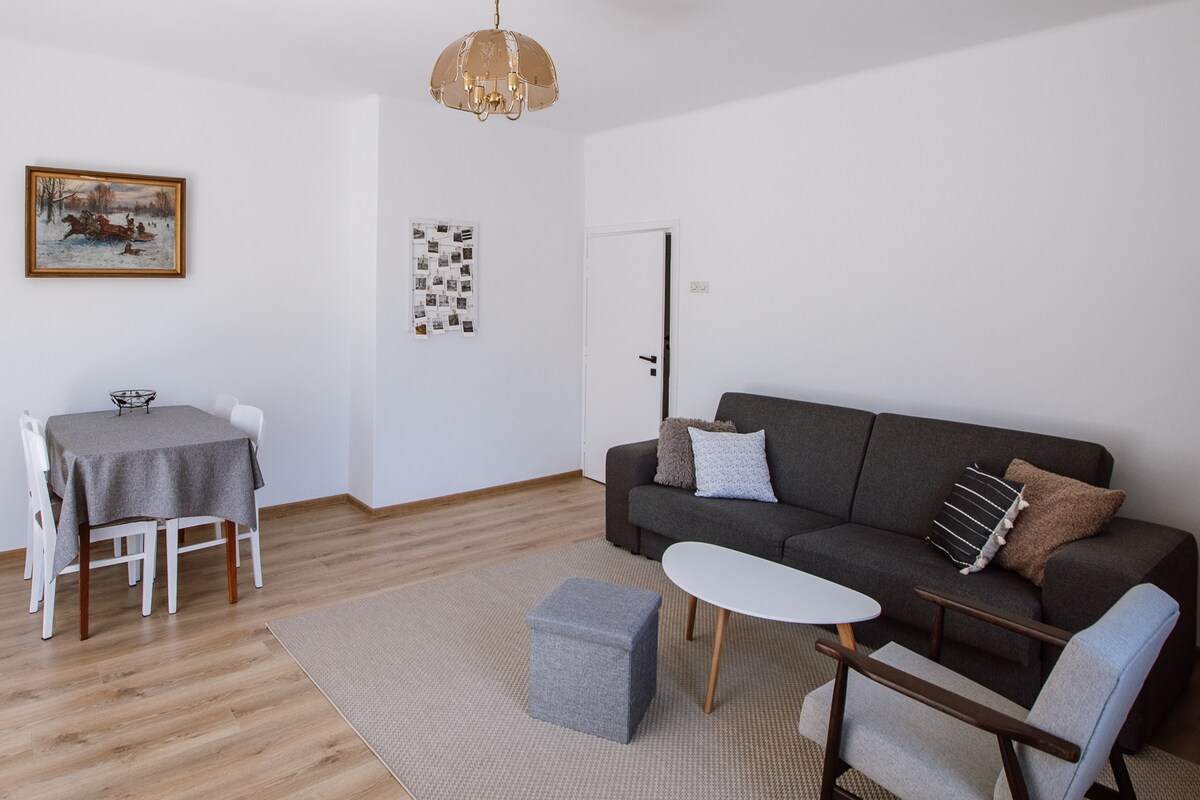 Komfortowy apartament w centrum miasta. Do dyspozycji całe mieszkanie 48 m - sypialnia z podwójnym łóżkiem (szerokość 140 cm) oraz salon z aneksem kuchennym. W salonie rozkładana sofa . W pobliżu główne zabytki miasta. ( 400m ratusz miejski, 950 m - rynek starego miasta, zamek). Dostępne 1 bezpłatne miejsce na prywatnym zamykanym parkingu, tuz obok budynku. Ponadto w pobliżu również miejski parking (od godz.17 oraz w weekendy bezpłatny).