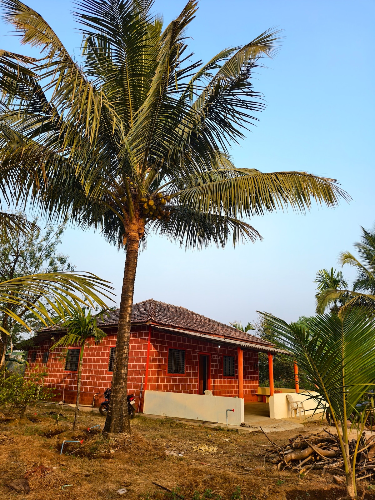 De bungalow, gebouwd op een boomgaard van 4 hectare in het schilderachtige Konkan, is een perfect uitje voor familie en vrienden of een serene plek om'thuis te werken' met een BSNL-netwerk. De luchthaven van Sindhudurg-Chipi en toeristische attracties liggen op ongeveer een uur rijden. Maak verbinding met de natuur in een ontspannen tempo. Geniet van je ogen op het groene groen. Word wakker van de roep van vogels, loop naar de rivierkant of zwaai naar de koeien die voorbij lopen om te grazen. Ontspan op hangmatten of relax in een dompelbad. Kinderen zullen genieten van de natuur. Welkom