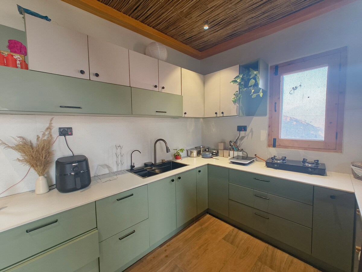 Een met de hand gebouwd bergverblijf op 2400 m — waar de weg eindigt en de Himalaya elk raam vult. Door architect ontworpen villa met glazen wanden, houten interieurs en besneeuwde toppen vanaf je bed. Elke balk met de hand of door een ezel naar boven gedragen — gebouwd op de oude bergmanier. Bereikt via een 25–30 minuten bergopwaartse trektocht vanaf het parkeerpunt — een echt bergpad, geen vlakke wandeling. Plan dienovereenkomstig als je met senioren of jonge kinderen reist. Paarden beschikbaar op aanvraag.