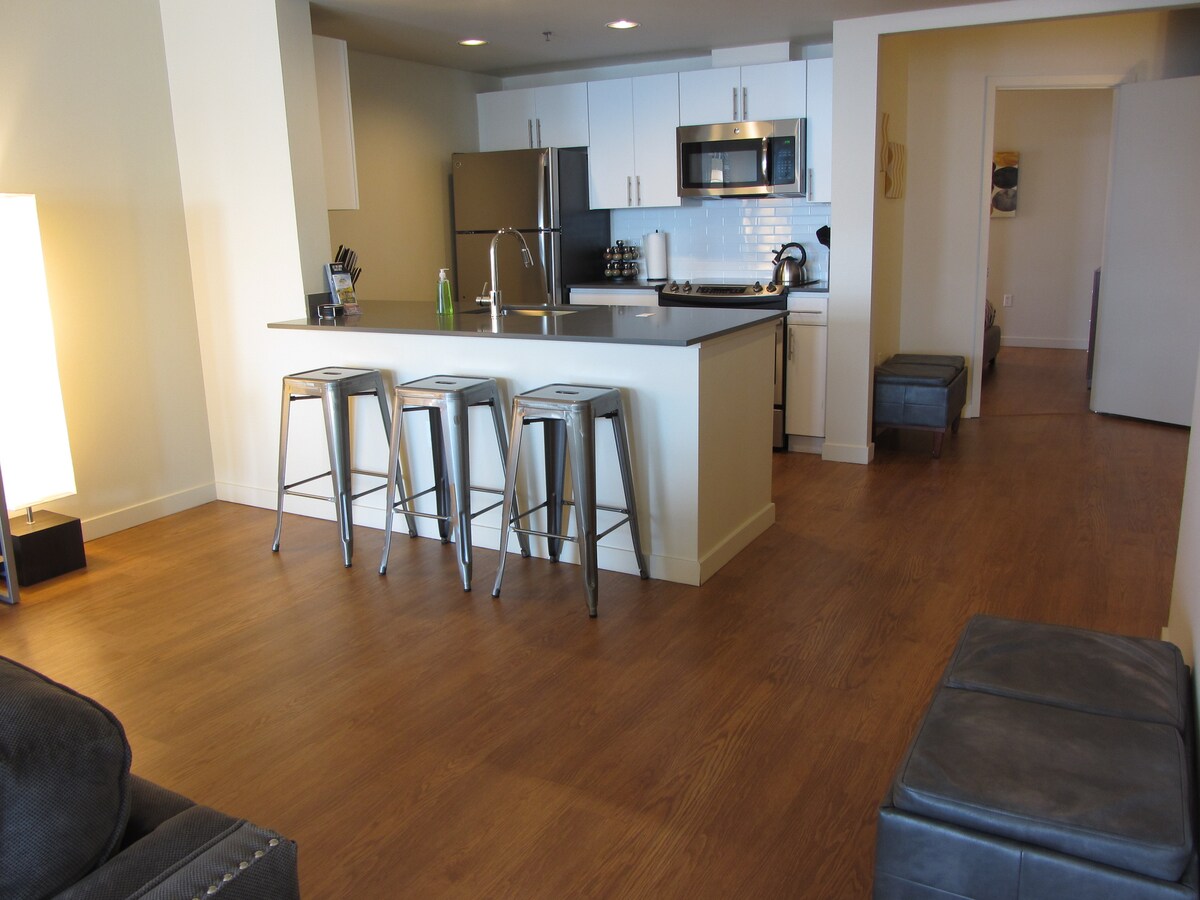 Annuleringsvoorwaarden van 30 dagen voor volledige restitutie! Professioneel gereinigd en gedesinfecteerd tussen gasten. Ons geweldige schoonmaakteam werkt al meer dan 10 jaar met ons samen. Harbor Steps ligt dicht bij alles wat je wilt doen/zien in Seattle! U zult genieten van deze enorme 2-bed, 2 badkamers eenheid, plus den/nook gebied vanwege de prachtige Puget Sound Views, geweldige klantenservice, en de perfecte binnenstad van Seattle locatie (in de buurt van Pike Pl Market en waterkant) - lopen score 99. Maximaal 8 slaapplaatsen, maar maximaal 6 volwassenen.