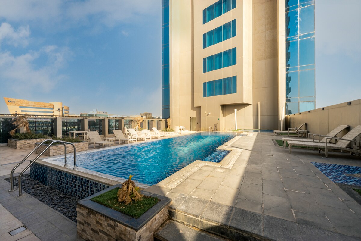 Luxe appartement in de wijk Hattin naast Riyadh Boulevard in het gebouw van Homtel Residence Met een slimme zelfingang bestaande uit: - Privézwembad met uitzicht op KAFD en de boulevard - Biljart - Buitenzitplaats - Woonkamer met smart-tv, eetkamer, keuken en gastenbadkamer - Volledig uitgeruste keuken (oven / koelkast / magnetron / koffiezetapparaat / waterkoker / automatische wasmachine / keukengerei) - Master bedroom met aparte badkamer - Twee slaapkamers met twee eenpersoonsbedden en een gedeelde badkamer - Opmerking: Riyadh Boulevard ligt op slechts 5 minuten lopen.