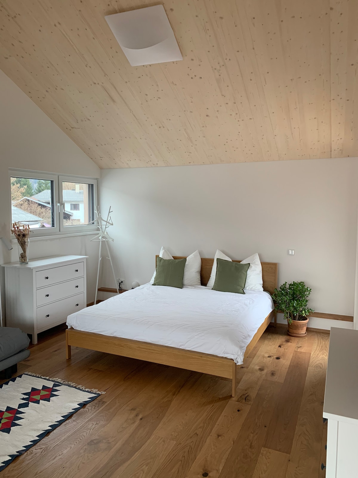 Fühle dich wohl in dieser Unterkunft mit Dachterrasse. Die Wohnung befindet sich im Obergeschoss unseres Hauses und wurde ganz neu errichtet. Die Wände sind aus Holz gebaut und strahlen Gemütlichkeit aus. Das Appartement besteht aus einem großen Raum mit Bett, Essplatz und komplett eingerichteter Küche und einem Badezimmer mit WC und Dusche. Du gelangst direkt auf die wunderbare Dachterrasse, auf der in Hochbeeten Gemüse und Kräuter wachsen und wo du dich entspannen kannst.