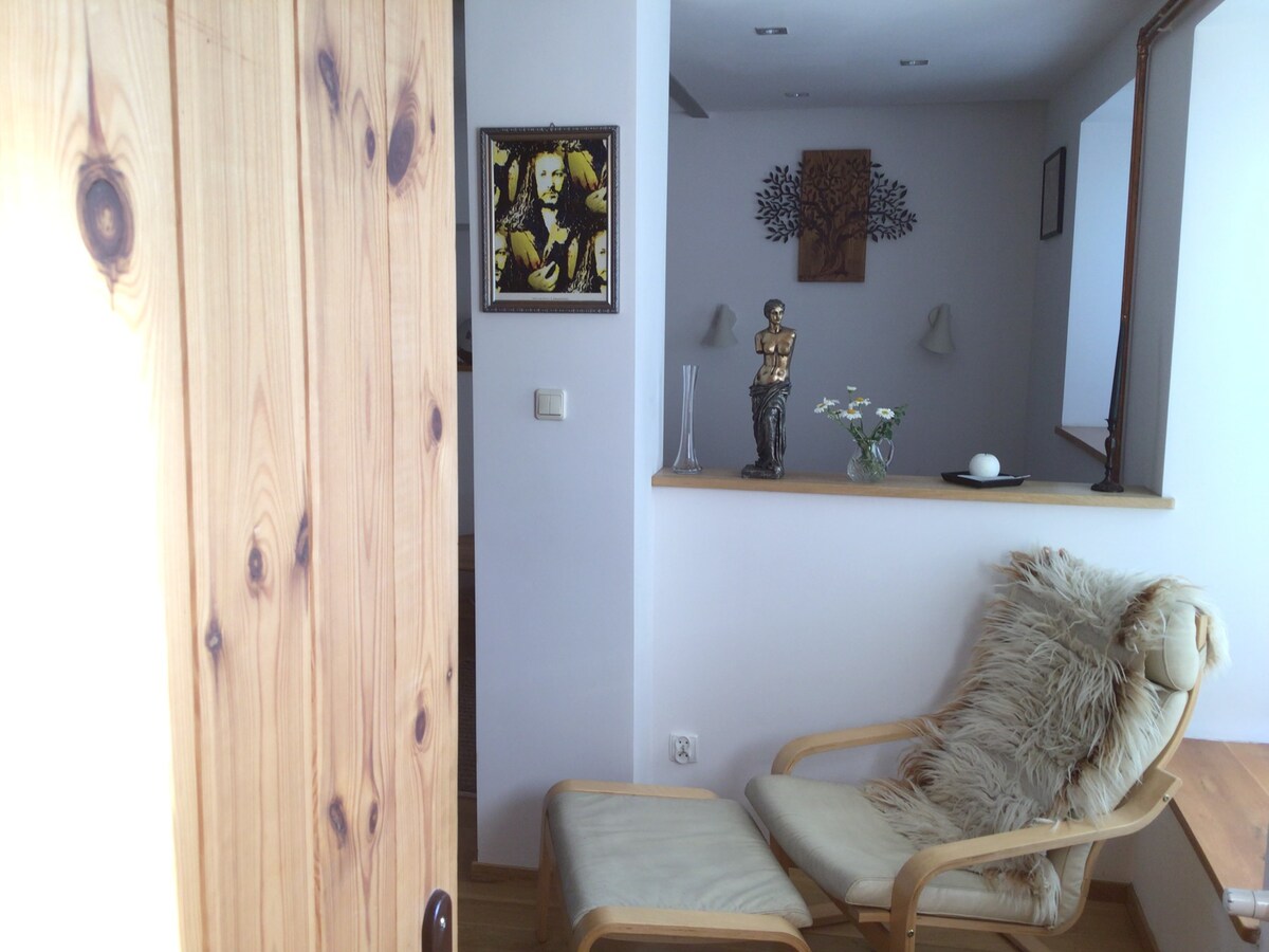 Wij nodigen u uit in ons prachtige appartement in een oud huis uit 1930, dat een grondige renovatie heeft ondergaan om de oude, originele stijl terug te krijgen. In het huis kunt u een brief schrijven op een oude typemachine, zien hoe een telefoon er vroeger uitzag, proberen een foto te maken met een 50 jaar oude camera en ontspannen in de tuin met een barbecue. Het huis is omgeven door groen en ligt in een rustige, vredige omgeving. Het huis is verdeeld in twee appartementen, de verhuurders wonen boven en de benedenverdieping wordt verhuurd aan toeristen.