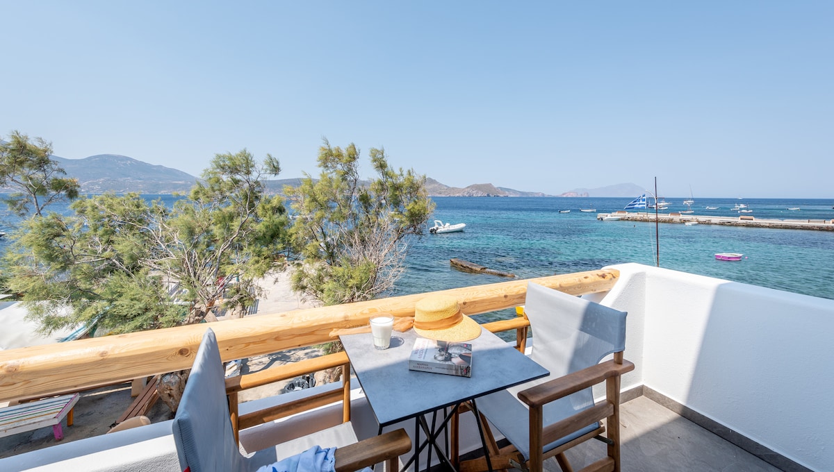 The Wind Apartment is a serene retreat nestled by the sea in Firopotamos, Milos—one of the most beautiful islands in the Mediterranean Sea. This charming apartment offers a unique experience, where the balcony literally extends over the water, and the beach, bustling with people, stretches out at your feet.