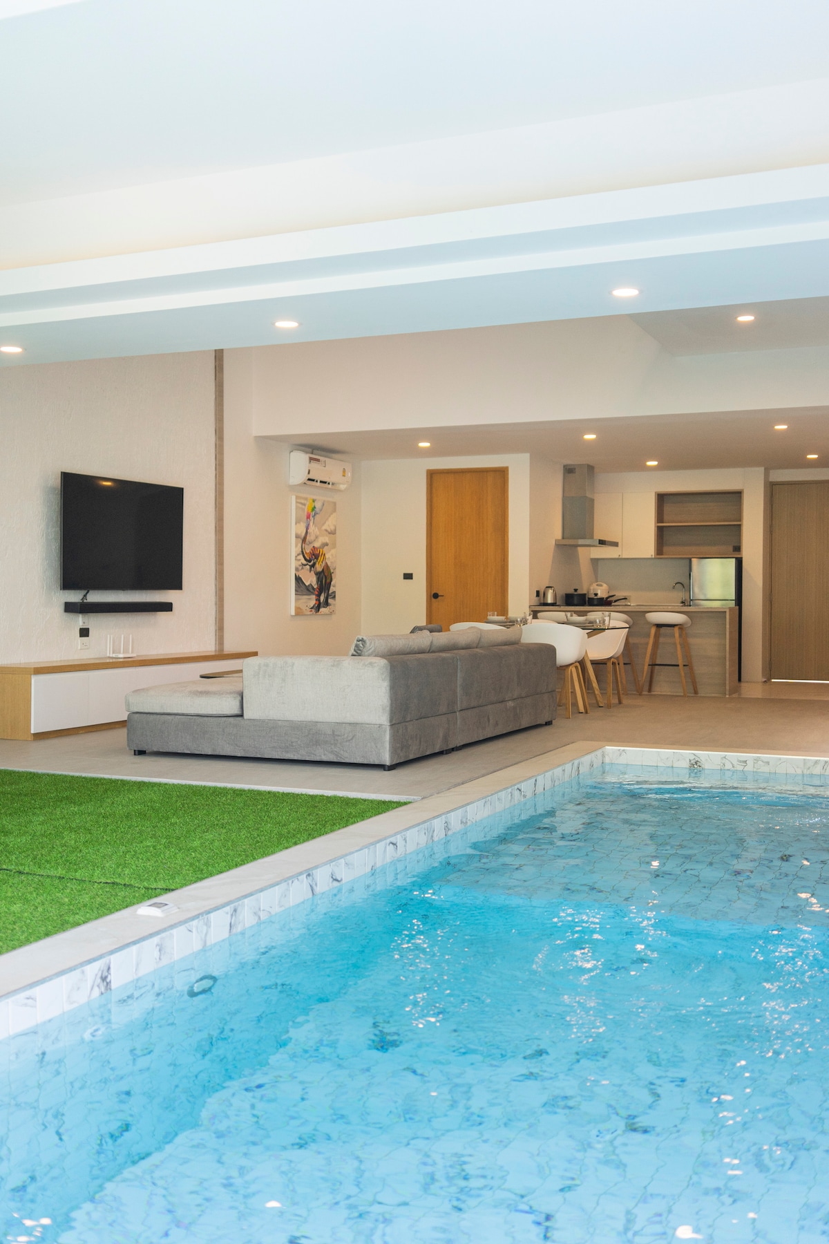 De villa ligt in het noordelijke deel van Samui. Het bevindt zich in een beveiligd complex met veel extra faciliteiten, zoals een fitnessruimte, een sauna, een groot gemeenschappelijk zwembad met kindergedeelte en een tennisbaan. De villa heeft een binnenzwembad dat dag en nacht kan worden gebruikt. De villa heeft snelle wifi (zeer goede dekking in alle ruimtes), een grote flatscreen-tv in de woonkamer en tv 's in beide slaapkamers. In alle kamers staat een goed geluidssysteem. En de villa biedt veel prive.