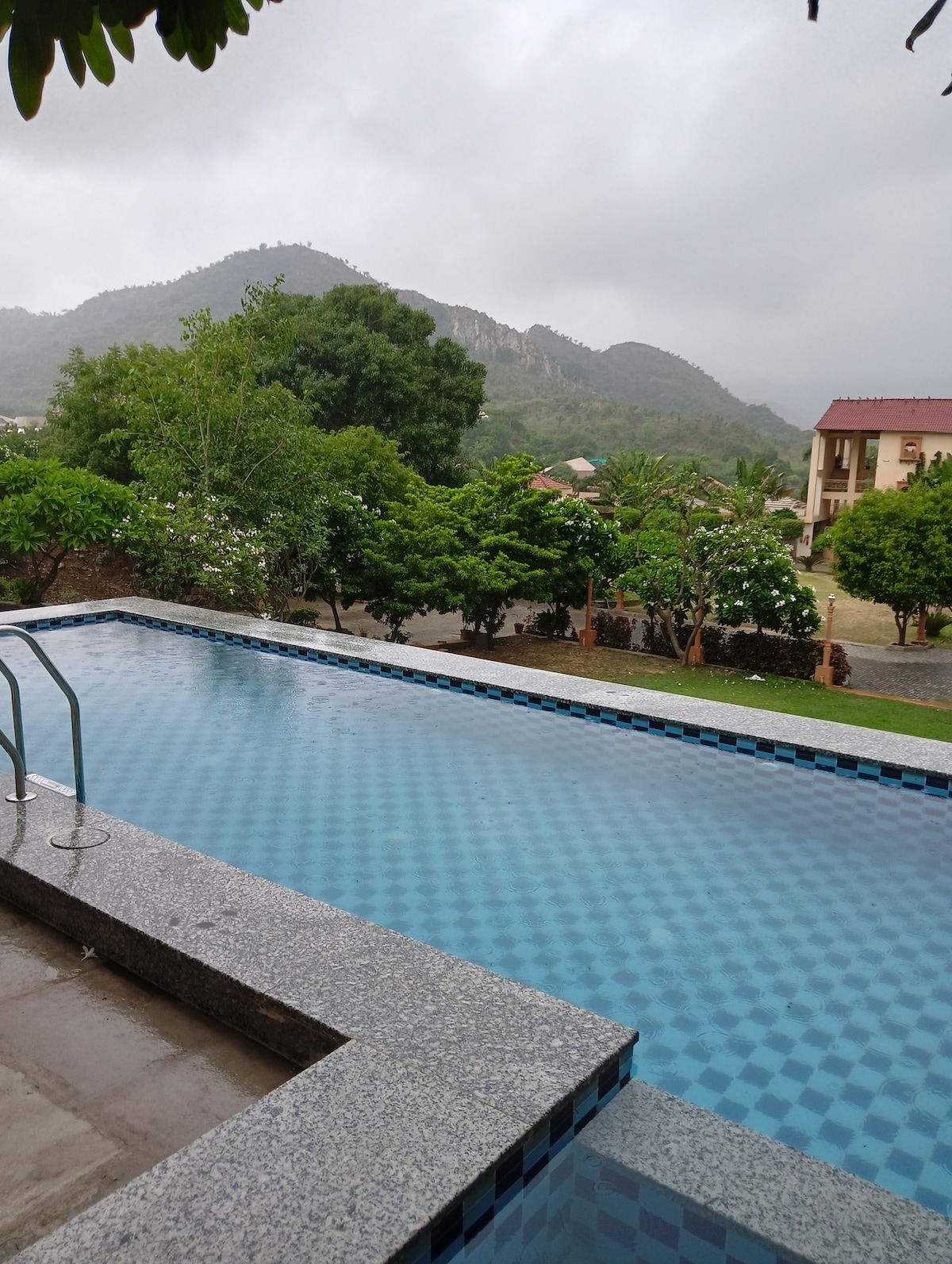 A picturesque 4BHK villa with star-light swimming pool, a room with an open sky bath tub , an open bathroom with Jacuzzi , a lake view terrace situated in mountains just 10 kms away from heartland where you get an attendant and a cook on request .