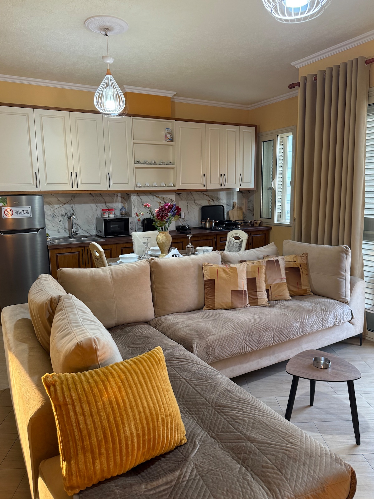 Al het vakmanschap en de creativiteit van een van de beste interieurstudio's van Albanië is in dit appartement gegoten. Een ruimte doordrenkt met mediterrane eenvoud, minimalistische elegantie en een subtiele 'vakantiesfeer' in elke hoek. Dit alles is omwikkeld in 70 m² comfort, waaronder een royaal balkon van 10 m² waar je kunt genieten van het uitzicht op het aquapark en de glooiende heuvels rondom het dorp Golem.