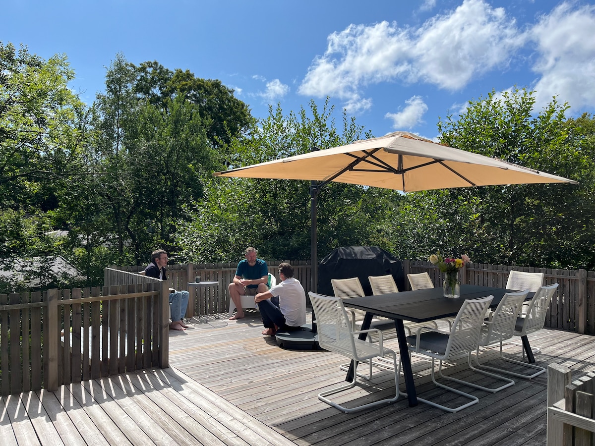 Aan de onderkant van onze prachtige tuin ligt ons gezellige bijgebouw, dat u voor uzelf heeft. Het bijgebouw is onlangs gerenoveerd in een charmante en gezellige stijl. Er is een kitchenette waar u ontbijt kunt maken. Als u warm eten wilt maken, kies dan een andere AirBnB. Het bijgebouw ligt dicht bij het bos en het strand. Het bijgebouw ligt op 1 km van het stadscentrum en op 1,5 km van de voedselmarkt, het station en Kronborg.