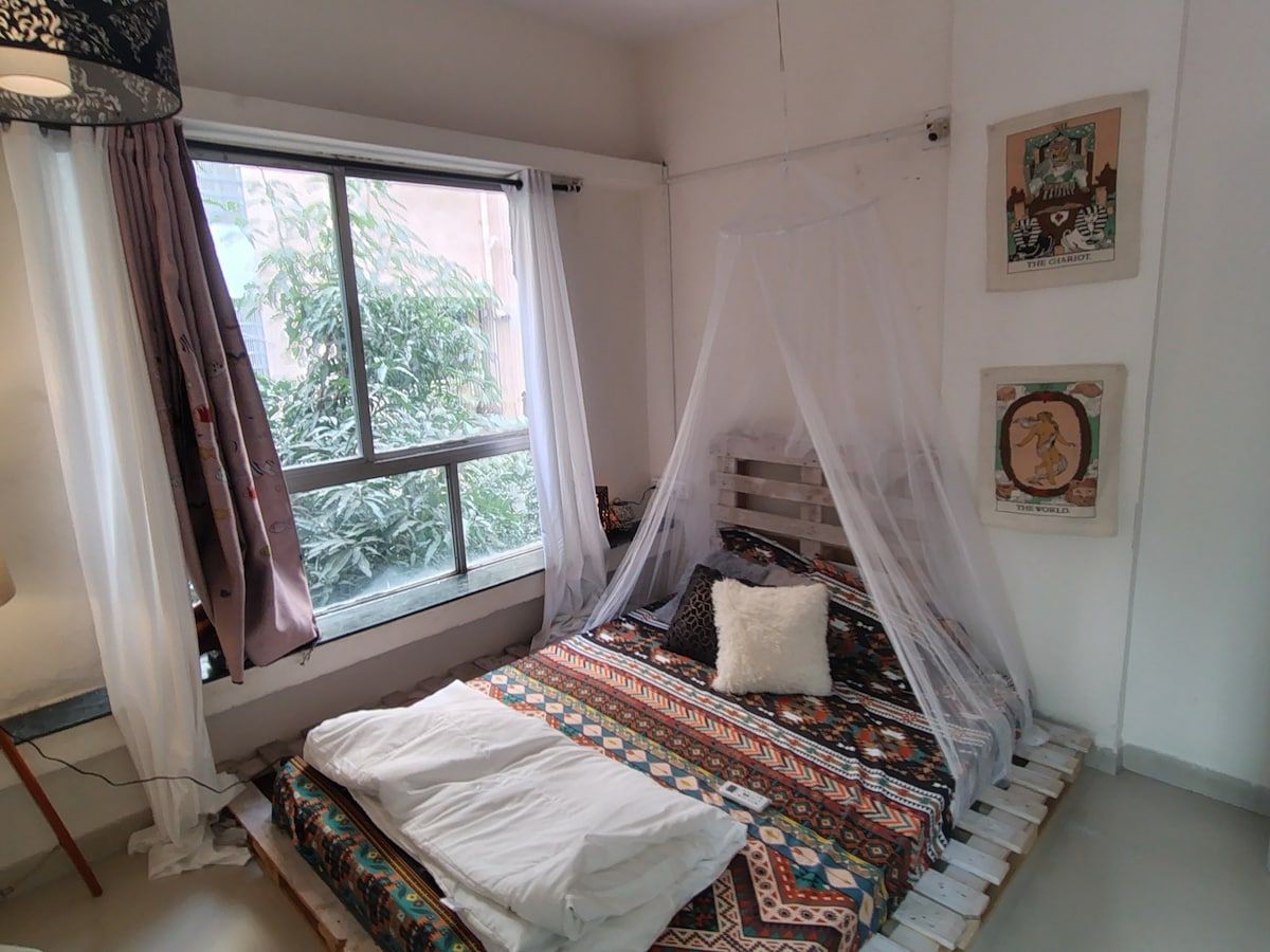 Doe het rustig aan in dit unieke en rustige uitje. Deze volledig ingerichte woning ligt op slechts vijf minuten rijden van de luchthaven en is gemaakt in een elegant Boheemse thema, gevuld met planten en rustgevende kleuren, waardoor het vredig en gezellig is. Het heeft een volledige operationele keuken, een badkamerkast, 1 slaapkamer , 1 woonkamer, een eethoek op het balkon met bbq. Deze speciale plek ligt in viman nagar en zeer dicht bij Koregaon park, Kalyani nagar en kharadi . Het is zeer ruim en vrijgezel, stel, familie en huisdiervriendelijk.